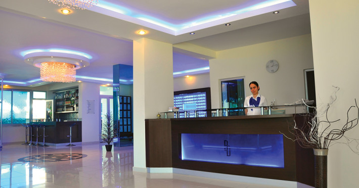 Hol spațios decorat modern, lobby bar recepție, 2 lifturi, lounge, lounge cu TV, restaurant, bar la piscină, cantină și snack bar, minimarket, fotograf, baie turcească, saună, masaj, sală de sport, internet cafe, sală de lectură, piscină în aer liber si sectiune copii, 2 tobogane cu piscina de activitate, terase la soare, tenis de masa, biliard, volei pe plaja.