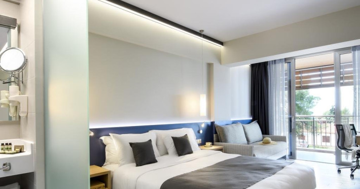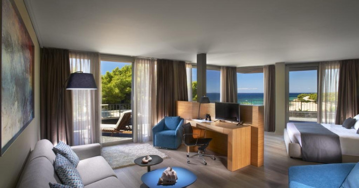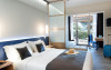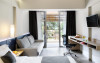 Deluxe Suite (60 mp2): vedere la mare, pat matrimonial, zona de living cu o canapea extensibila.