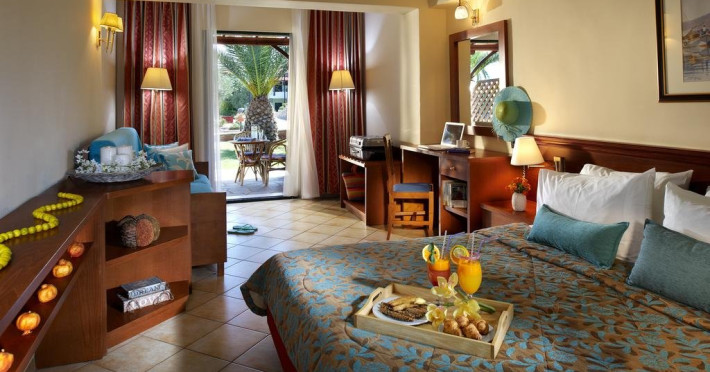 Deluxe Family Suite (50-55 mp): la etaj, cu vedere la gradina sau partiala la mare, 2 spatii separate de dormit si 2 bai.