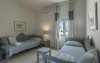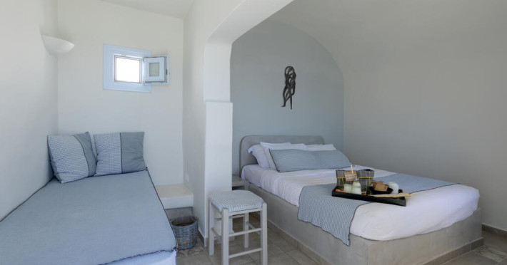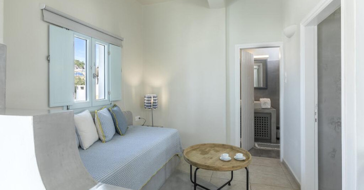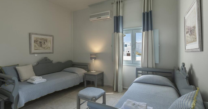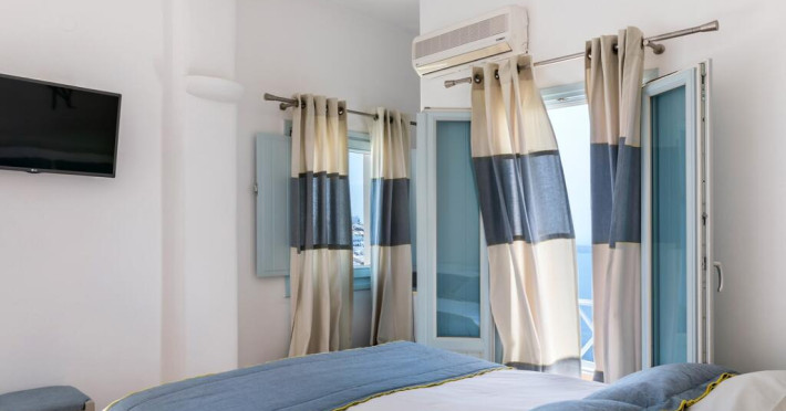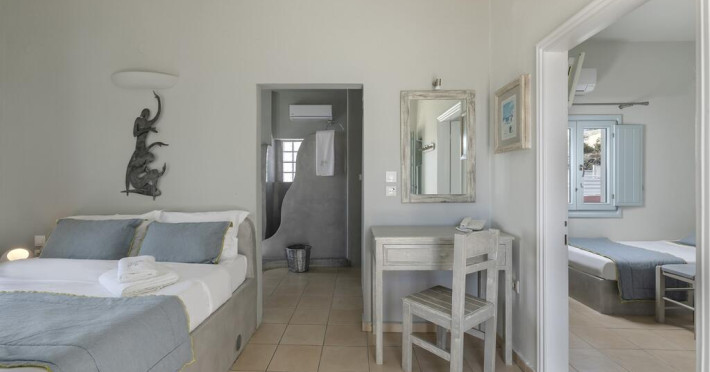 Sunt disponibile 7 camere. Unele camere au balcon cu vedere la mare, unde oaspeții pot admira apusul sau răsăritul soarelui. Camerele de la Blue Dolphins Apartaments & Suites sunt dotate cu aer condiționat, Tv cu canale prin satelit și seif. Fiecare cameră dispune de minibar și mașină pentru preparare cafea sau ceai. În camere există baie cu cadă sau duș prevăzută cu halate de baie și papuci.