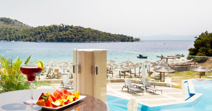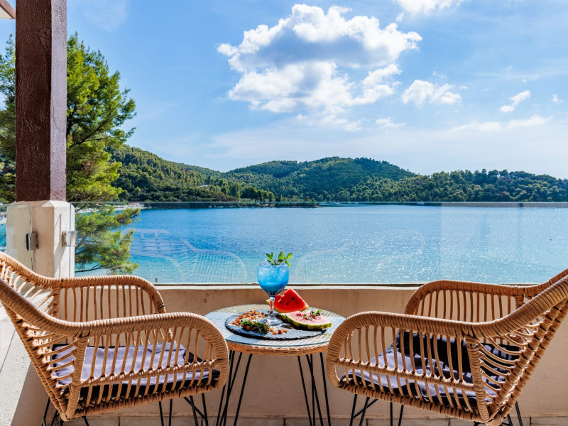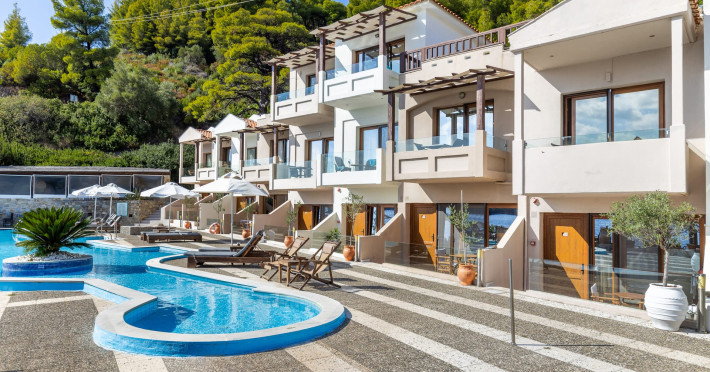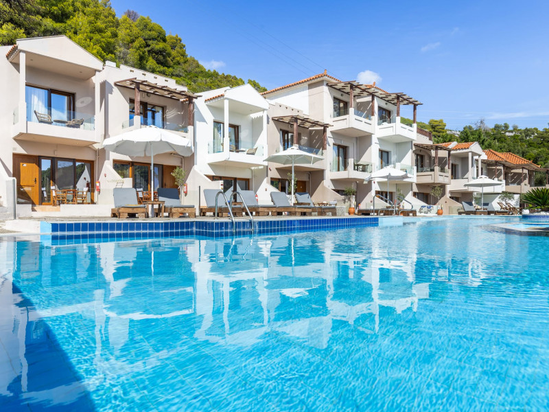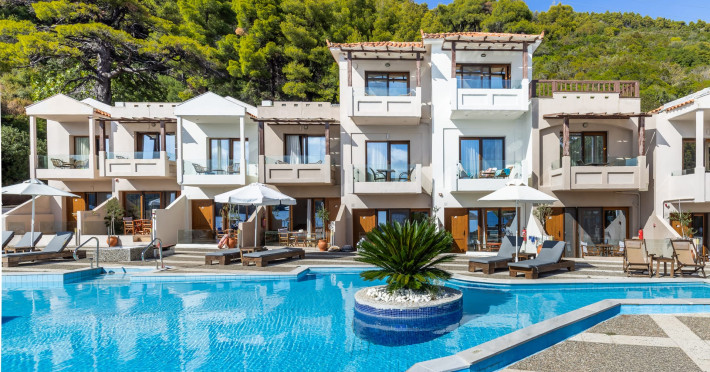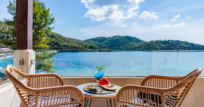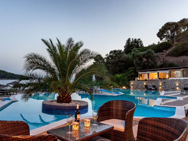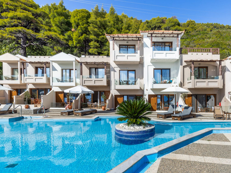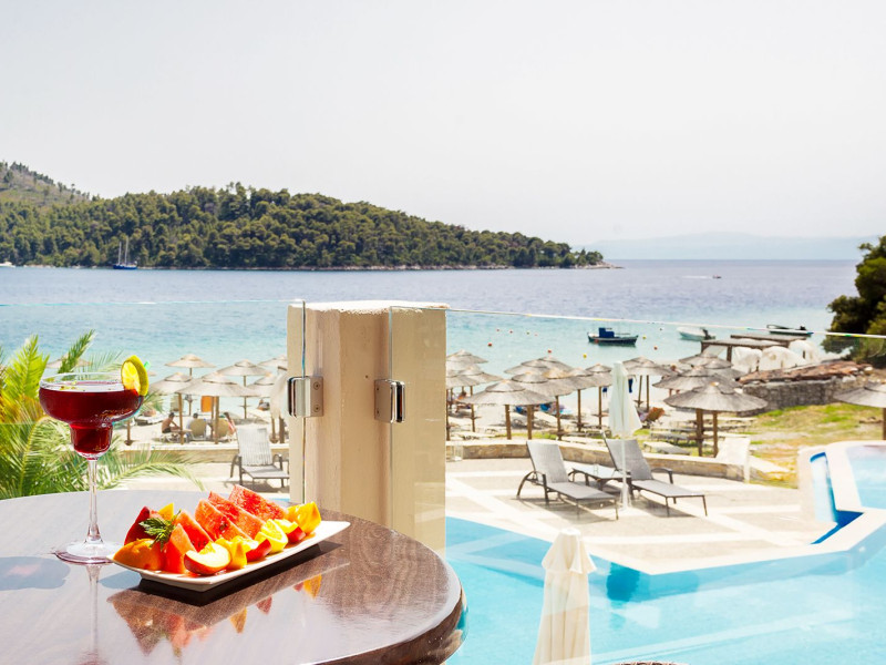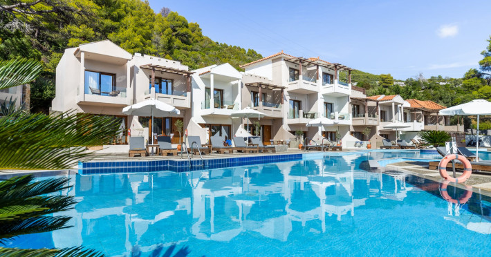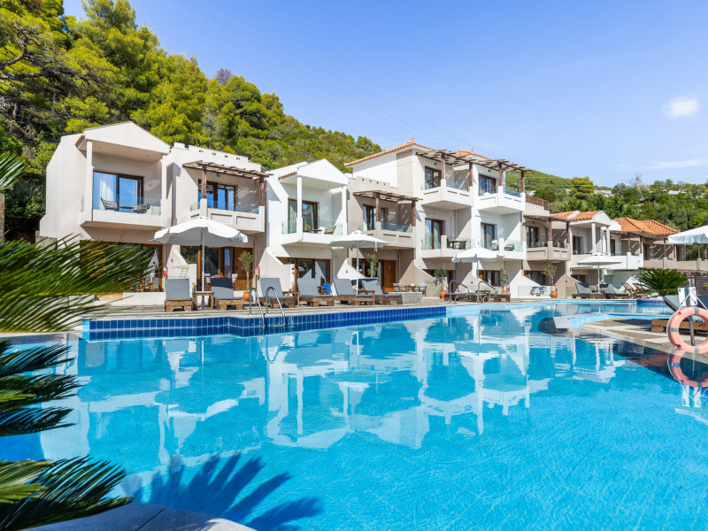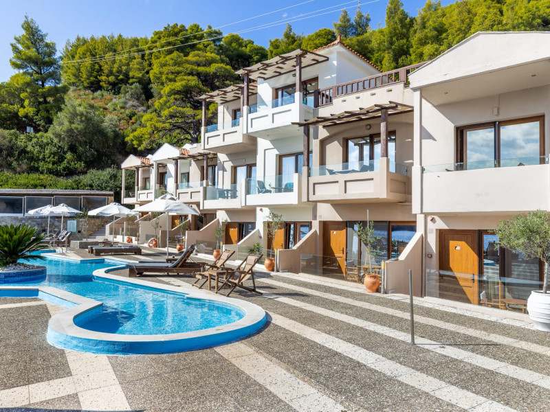 Located in one of the most enchanting landscapes of Skopelos island, in the green bay of Panormos and at a distance of 12-16 km southwest of Skopelos Town, the 3-key "Blue Green Bay" property was created in 2009. The complex is built in the peaceful embrace of the cove, on the Blue Flag awarded beach and is a real oasis of relaxation, comfort and enjoyment of the sea.The eighteen rooms of double, superior double and suites, all elegant, with the magnificent beach stretching out in front of them and pine trees reaching the sea all around, make up a painting of indescribable beauty.From the terrace or the balcony of the rooms, guests have the privilege of enjoying the view of this unique picture across the bay of Bloe, a small natural harbor with a magnificent sunset. The swimming pool is outstanding and the umbrellas along with the beach chairs are available free of charge to our guests.After a refreshing swim in the pool or the crystal clear waters of Panormos, you can enjoy a drink at the beach bar, under the shade of the huge pine trees of the accommodation.Located in one of the most enchanting landscapes of Skopelos island, in the green bay of Panormos and at a distance of 12-16 km southwest of Skopelos Town, the 3-key "Blue Green Bay" property was created in 2009. The complex is built in the peaceful embrace of the cove, on the Blue Flag awarded beach and is a real oasis of relaxation, comfort and enjoyment of the sea.The eighteen rooms of double, superior double and suites, all elegant, with the magnificent beach stretching out in front of them and pine trees reaching the sea all around, make up a painting of indescribable beauty.From the terrace or the balcony of the rooms, guests have the privilege of enjoying the view of this unique picture across the bay of Bloe, a small natural harbor with a magnificent sunset. The swimming pool is outstanding and the umbrellas along with the beach chairs are available free of charge to our guests.After a refreshing swim in the pool or the crystal clear waters of Panormos, you can enjoy a drink at the beach bar, under the shade of the huge pine trees of the accommodation.