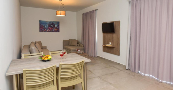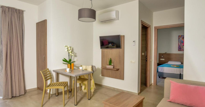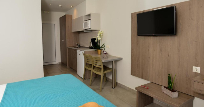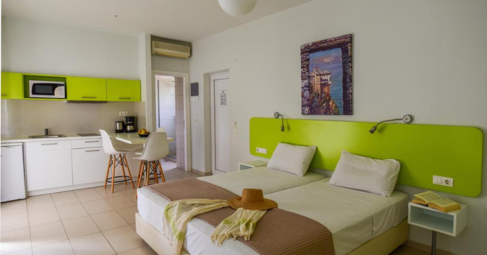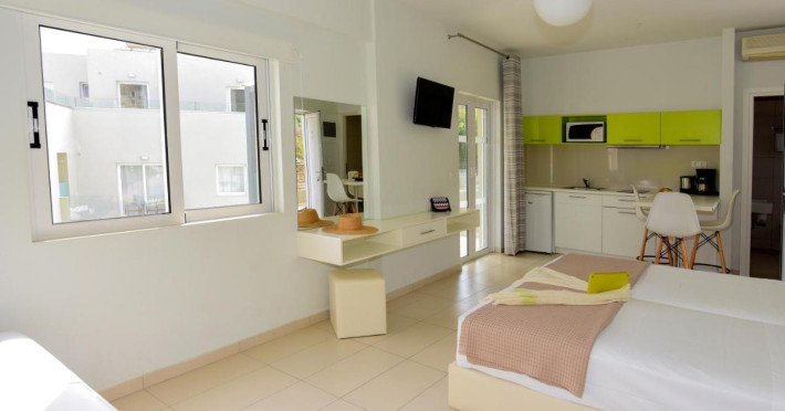 In its newly renovated facilities you will find spacious and tasteful studios and apartments, ideal for families and groups who want to enjoy their holidays without restrictions, in a peaceful and friendly environment. It has a pool for small and large, pool snack bar, mini market, parking, easy access to the beach and beach bar, fully equipped apartments with kitchenette, living room, terrace and bathroom as well as all the modern facilities and services that will make your stay unforgettable.