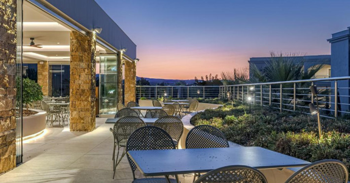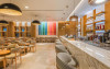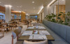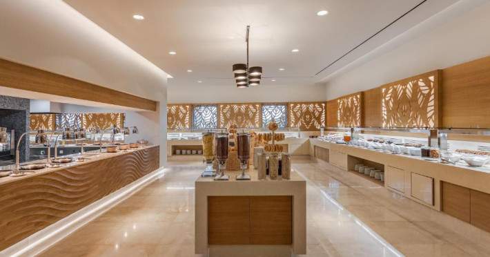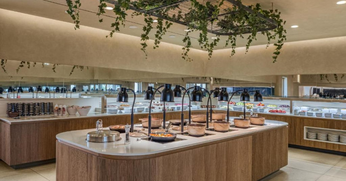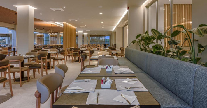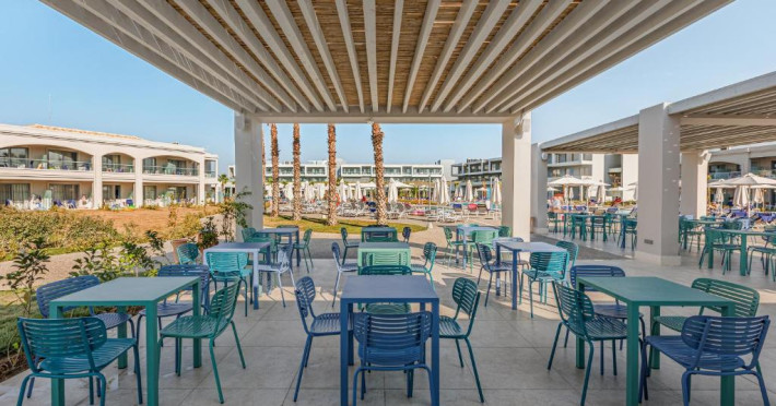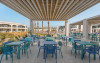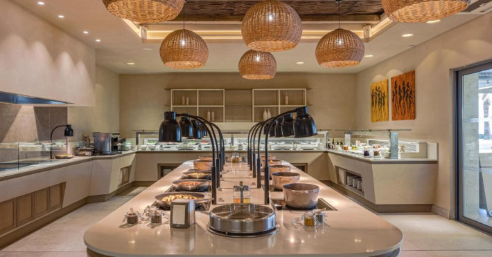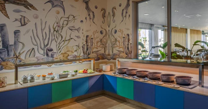 Proprietatea servește un mic dejun tip bufet, continental sau american. Blue Lagoon Queen are un restaurant care servește mancăruri din bucătăria grecească, italiană și mediteraneană. La cerere, sunt disponibile și preparate vegetariene, fără lactate și vegane.