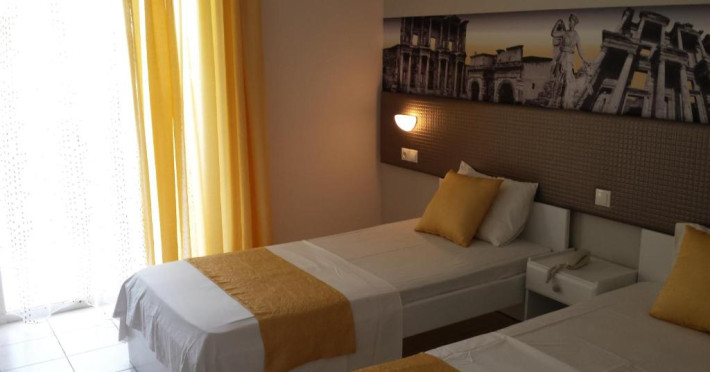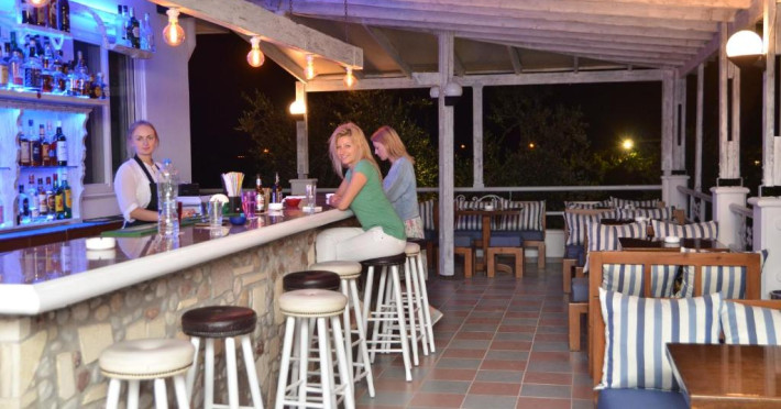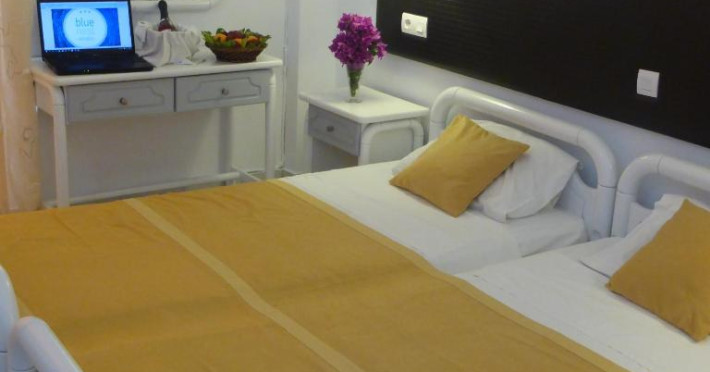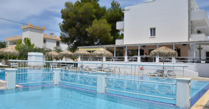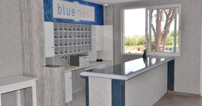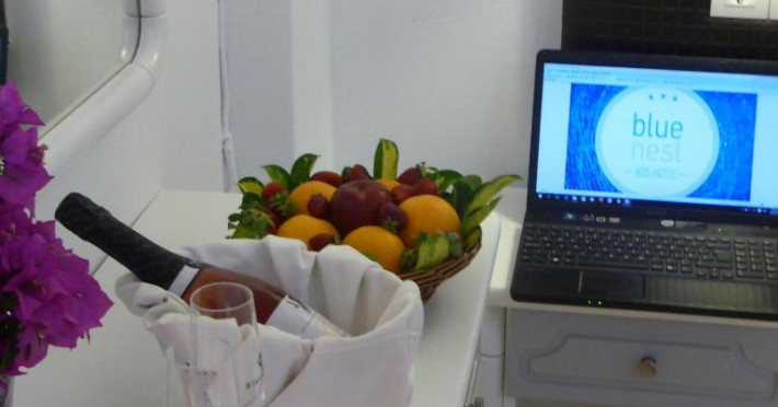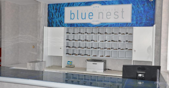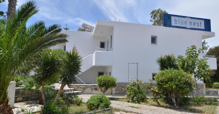 Hotelul Blue Nest, inconjurat de vegetație luxuriantă se află la 120 de metri de cea mai apropiată plajă și pune la dispoziție o zonă in aer liber și un restaurant. Oferă unități de cazare cu acces gratuit la conexiunea WiFi in toate zonele și balcon cu vedere la grădină sau la Marea Egee.