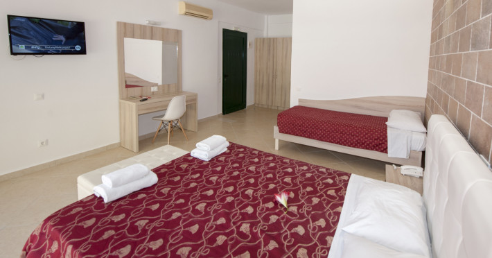 Un aparat de aer condiționat și un sistem de încălzire creează o atmosferă plăcută în camere. În majoritatea spațiilor de cazare clienții beneficiază de vedere spre mare de pe balcon sau de pe terasă. Camerele dispun de un pat dublu și de o canapea. Sunt disponibile dormitoare separate. Paturile suplimentare sau paturile pentru copii sunt disponibile pentru cei mici contra cost. Lucrurile de valoare pot fi păstrate în siguranță într-un seif. O chicinetă complet echipată cu un frigider, un minifrigider, un cuptor cu microunde și un aparat pentru cafea/ceai și cu toate ustensilele se găsește de asemenea în majoritatea camerelor. Un telefon cu apelare directă, televizorul, DVD player-ul și WiFi-ul oferă un concediu confortabil. În baia dotată cu un duș și o cadă există un uscător de păr. Articolele de cosmetică creează un confort deosebit în băi. Pentru familiile cu copii stau la dispoziție camere de familie.