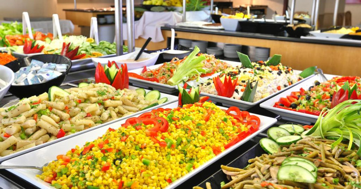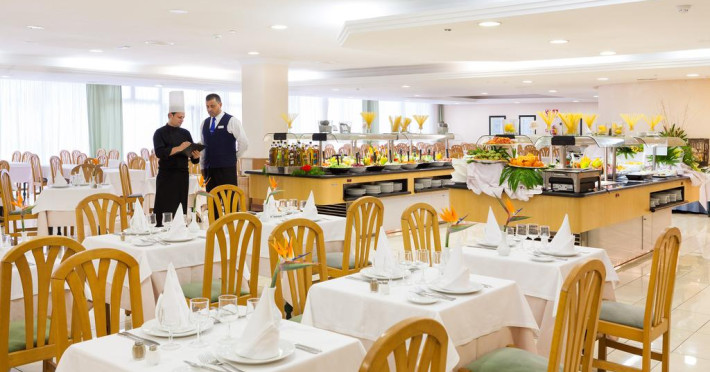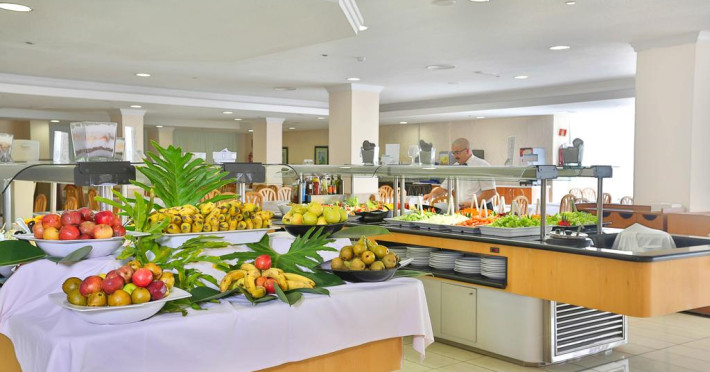 La Blue Sea Interpalace oaspeții au la dispoziție un restaurant care servește mâncare în stil bufet. Preparate din bucătăria internațională așteaptă să fie degustate în fiecare zi la micul dejun, prânz și cină. Masa poate fi servită atât în interior, cît si în aer liber, pe terasă, în funcție de vreme. Oaspeţii pot avea diverse băuturi răcoritoare sau alcoolice la bar. În cadrul proprietății există și un snack bar care servește băuturi și gustări.