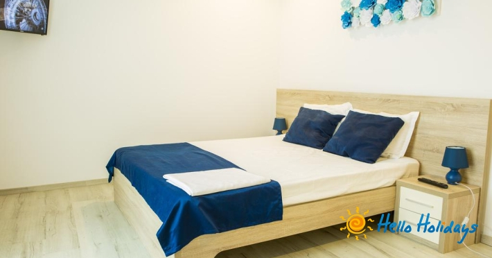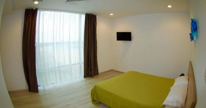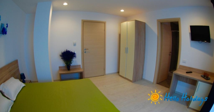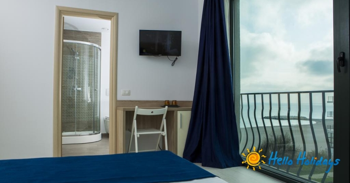 Apartamente superior au vedere frontala la mare, doua camere dotate cu pat matrimonial, living, TV, minibar, internet.