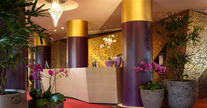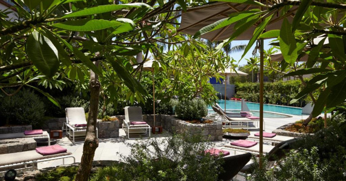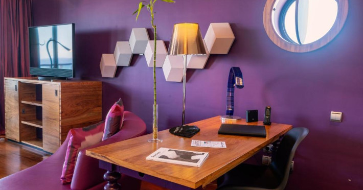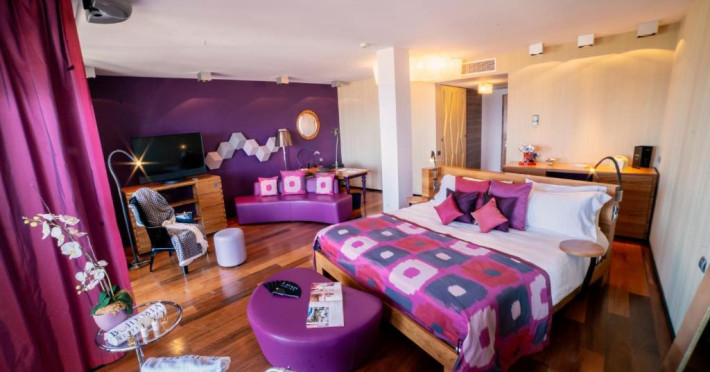 Camerele elegante de la Bohemia Suites & Spa - Adults Only au culori galbene, teracotă sau violet, cu mobilier din lemn de măslin.
