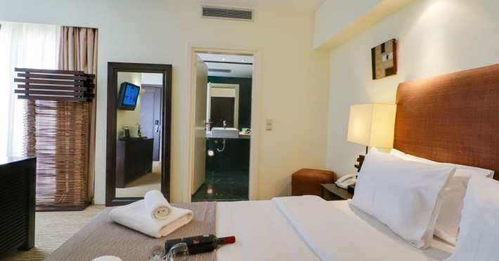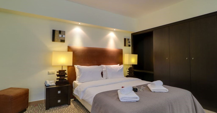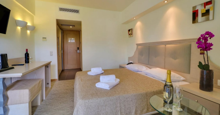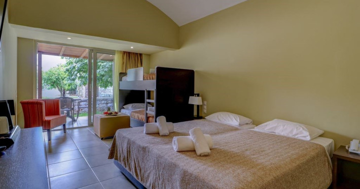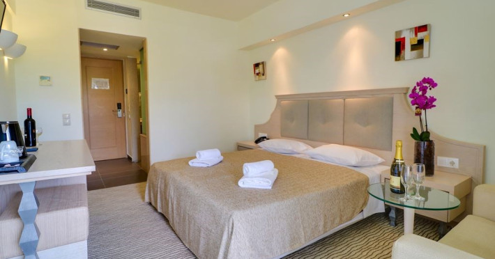 Sunt disponibile 264 camere. Camerele confortabile de la Bomo Olympus Grand Resort au pardoseală de gresie/ marmură, aer condiționat, Tv cu canale prin satelit și seif. În camere există baie cu cadă sau duș ce are în dotare foehn și articole de toaletă gratuite. Unele camere au balcon cu vedere la mare sau la piscină. Fiecare cameră dispune de mașină pentru preparare cafea sau ceai, fierbător și minibar. Curățenia in cameră se face zilnic. Toate camerele spațioase de la Bomo Olympus Grand Resort au zonă de relaxare. Fiecare unitate de cazare are frigider. Proprietatea oferă camere pentru familie cu o suprafață mai mare și un număr mai mare de paturi față de cele standard.