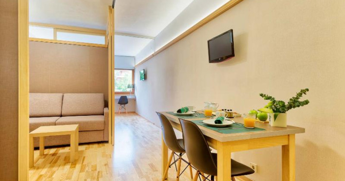 2 suites and 21 apartments are located on 6 storeys and can be reached by lift. Multilingual staff (English, German, French) at the reception are happy to assist guests at the reception desk round the clock. Check-in and check-out are available 24 hours a day. Services and facilities include a baggage storage service, a safe, a car hire service, room service, a laundry service, a fax machine and a coin-operated laundry. Wireless internet access is provided in public areas. The tour desk offers assistance with booking excursions. The apartment hotel has a range of facilities for guests with disabilities. Guests arriving by car can park their vehicles in the garage (for a fee) or in the car park. Services include a hotel shuttle bus.Datorita dinamicitatii domeniului disponibilitatea ofertelor se modifica de la un moment la altul. De aceea ofertele sunt valabile in limita locurilor disponibile. Agentia nu este responsabila pentru eventualele neconcordante care pot aparea intre informatiile privind tarifele si alte detalii din site si informatiile primite in agentie. In aceste cazuri vor avea prioritate, intotdeauna, informatiile primite in agentie.