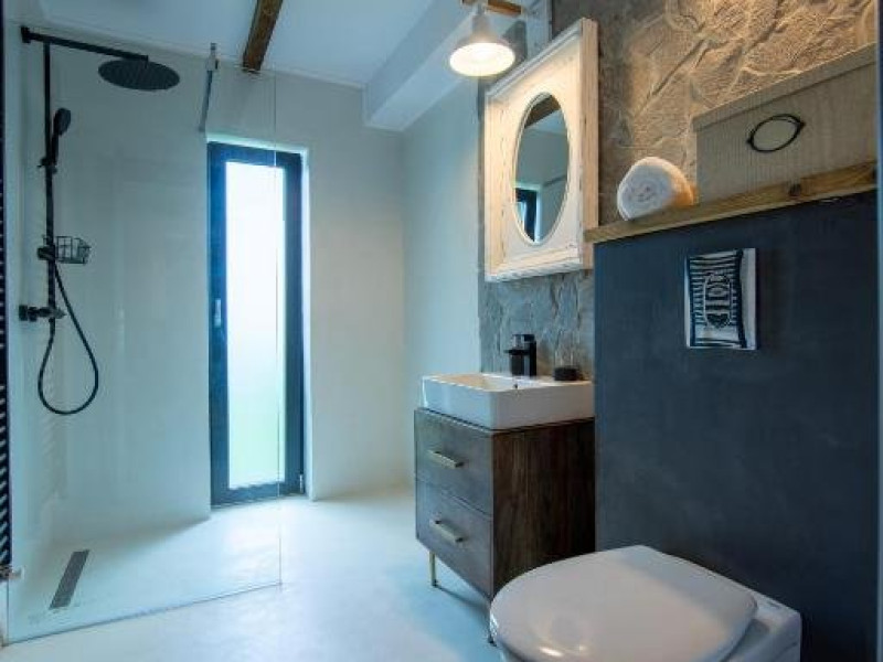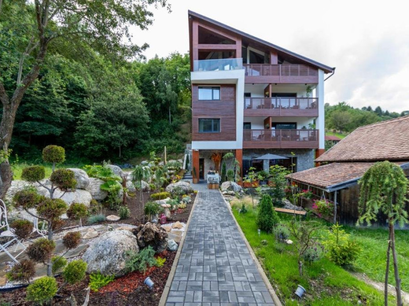 8 camere cu baie proprie + 3 bai in spatiile comune, 1 salon impartit in zona pentru servirea mesei si zona de relaxare, 1 mansarda spatioasa cu terasa, dotata cu:biblioteca (1500 de carti), TV cu Netflix, birou de lucru, PC si imprimanta,PS4 si jocuri de societate, home cinema si semineu, Kit produse de igiena personala, Internet wireless