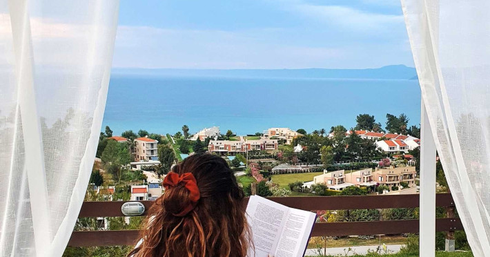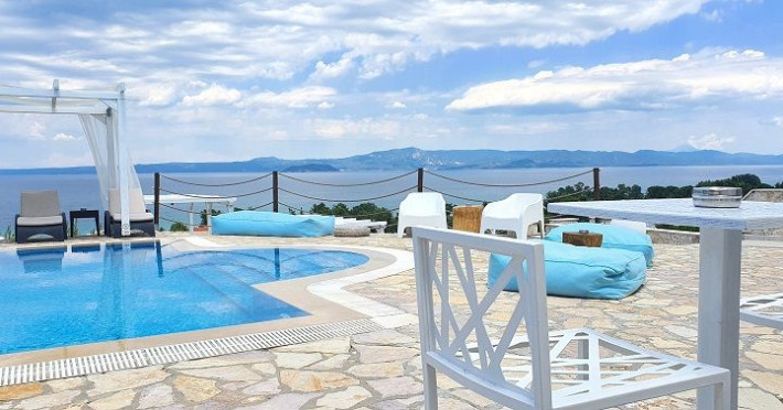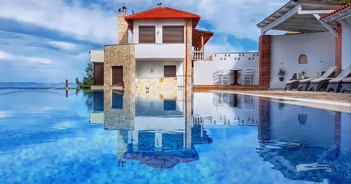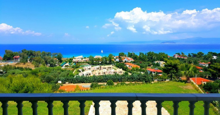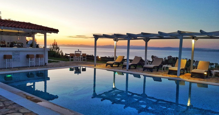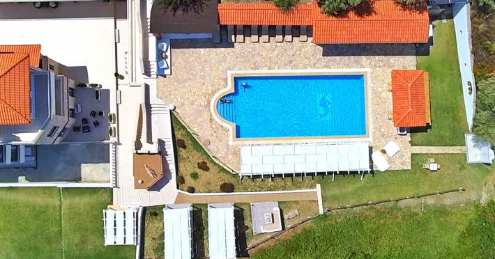 Just 300 meters from the beach and 1 km from the village center, the panoramic location of our hotel gives the visitor a unique view of the sea and the island KELIFOS. From the balconies of Bungalow White can also one, to distinguish the top of Mount ATHOS.