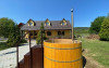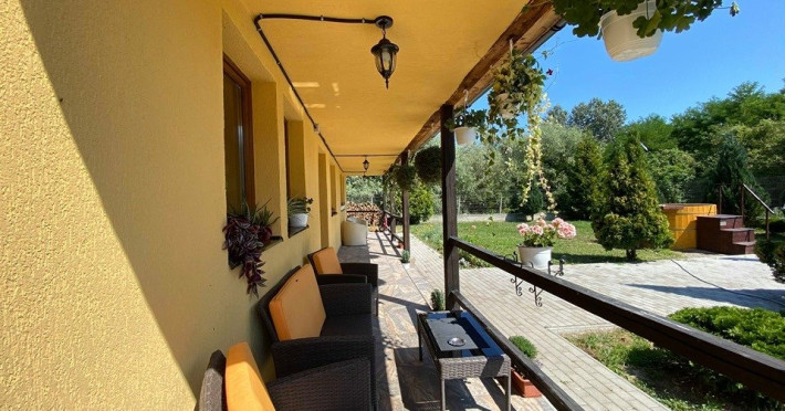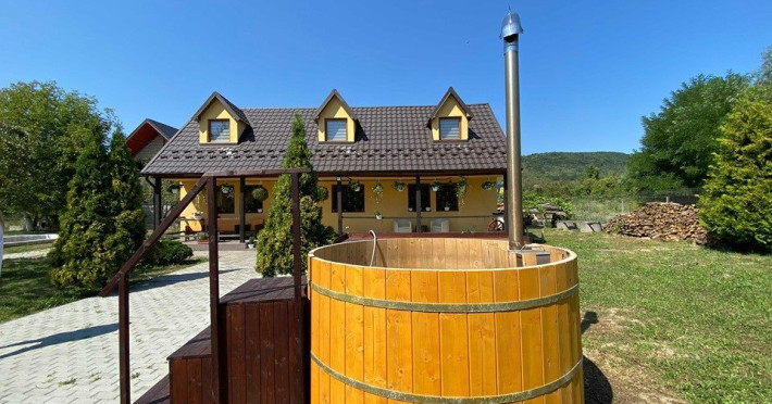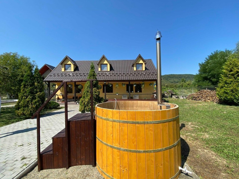 Afara are o terasa pentru servit masa si pentru gatit si un ciubar de 8 persoane.