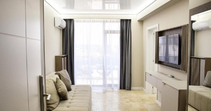 Premium Dubla, cu o suprafata de 35 mp, detine dormitor cu pat matrimonial dublu si living cu canapea extensibila, balcon, baie cu dus, uscator de par, TV, AC, internet, cana fierbator. Poate acomoda 2 adulti si 2 copii 0 - 17.99 ani, sau 4 adulti.