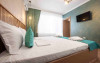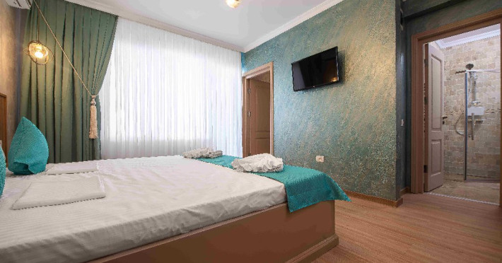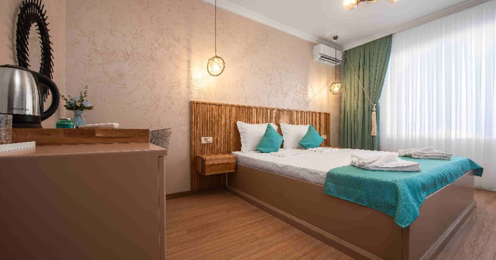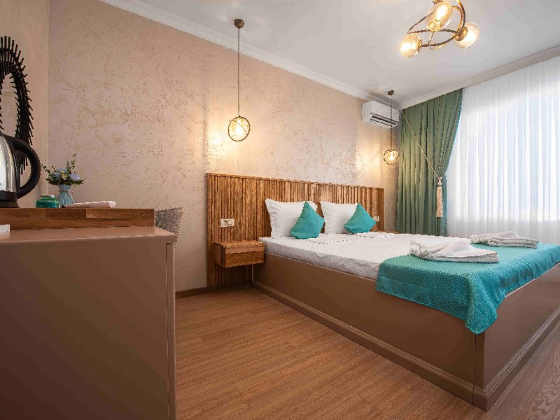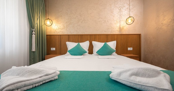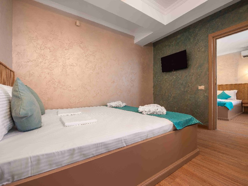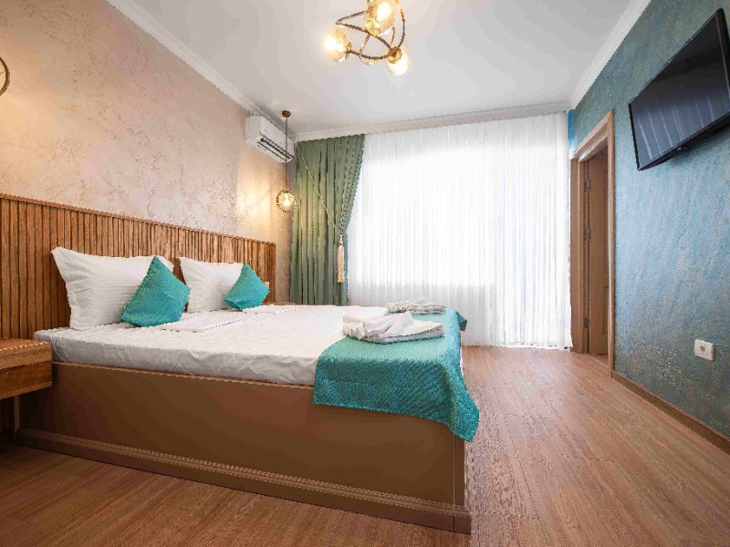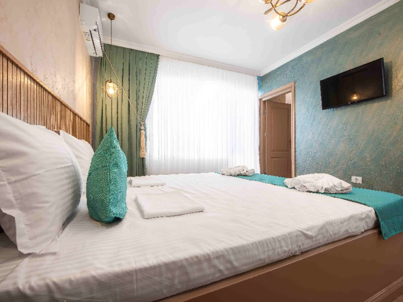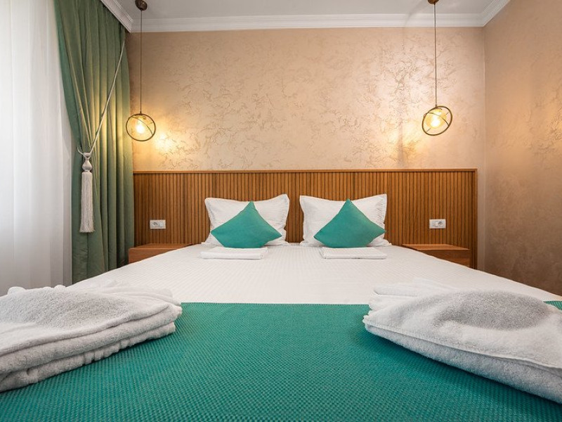 APARTAMENT DELUXE (1): suprafata de 45 mp, este compus din 2 dormitoare si 1 baie. Dotari: aer conditionat, internet WI-fi, minibar, Smart TV, servicii de difuzare (streaming), plita, fierbator: apa, ceai, cafea, umerase, uscator de par, articole de toaleta, prosoape, balcon/terasa.