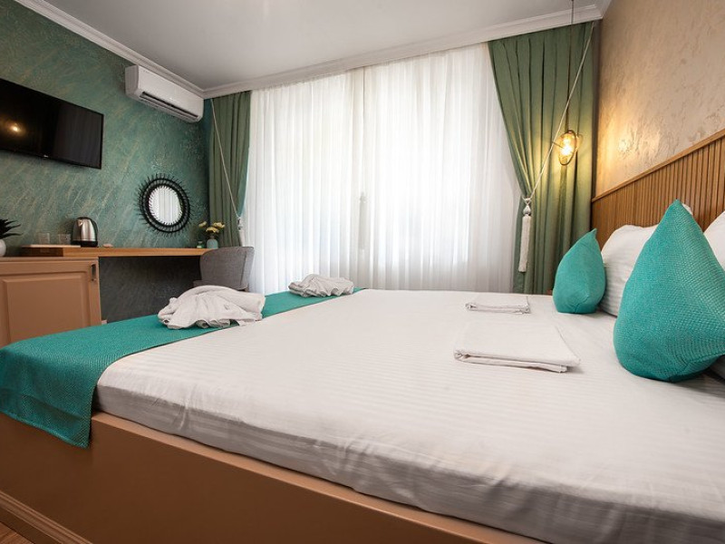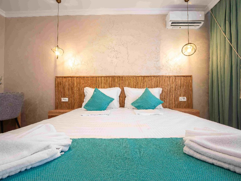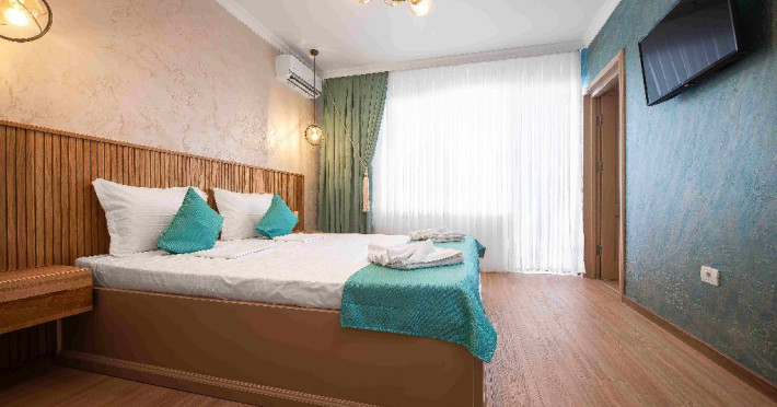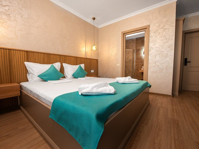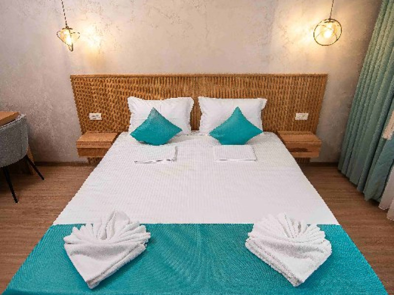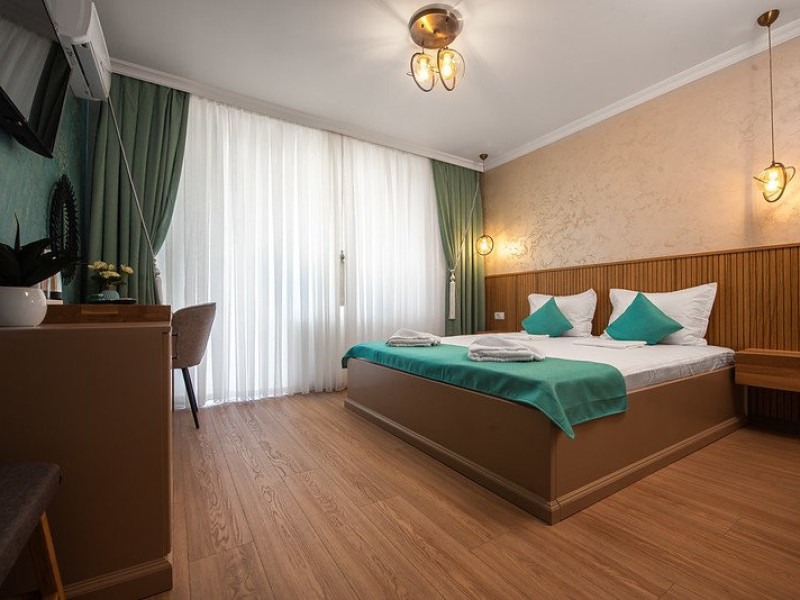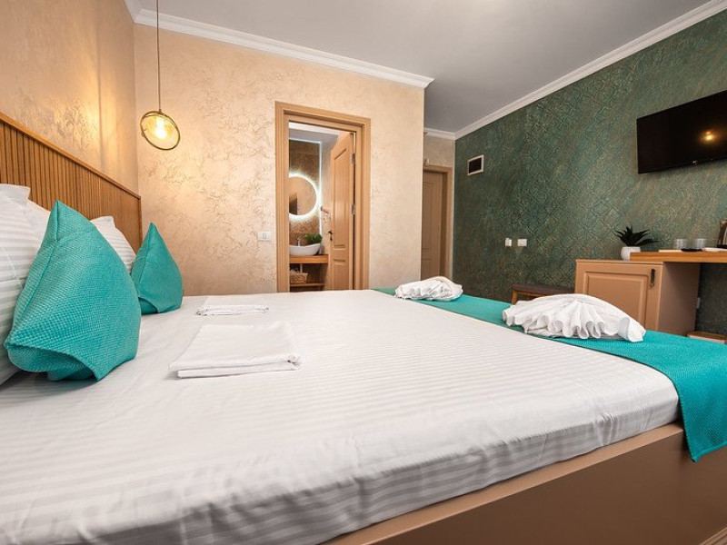 CAMERA DUBLA DELUXE (2): suprafata 23 mp, pat matrimonial king size: 180/200 (saltea ortopedica Memory Cotton spuma memory), aer conditionat inverter, minibar, TV Smart Led cu ecran plat, servicii streaming NETFLIX, baie proprie cu cabina de dus, uscator de par, umerase, fierbator: apa, ceai, cafea, articole de toaleta, balcon/terasa, mobilier terasa, internet WI-fi.