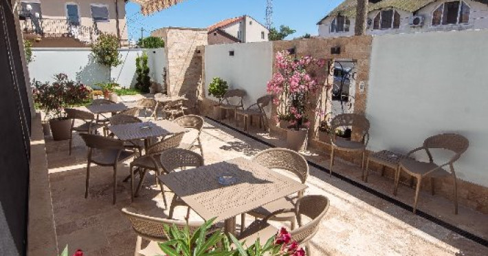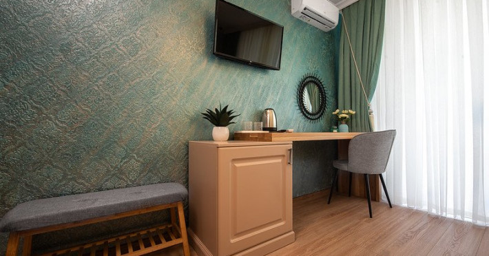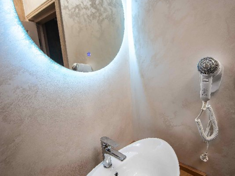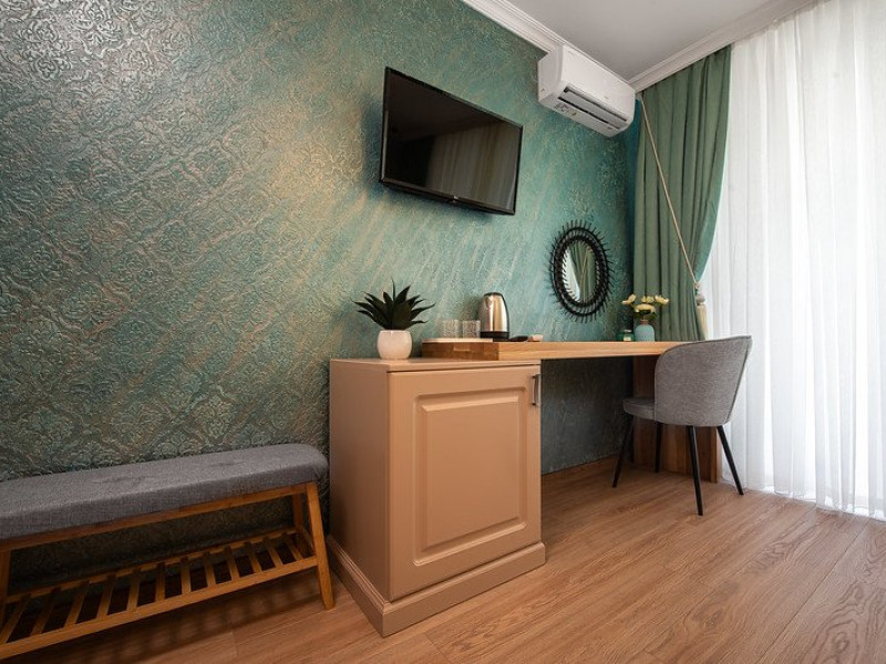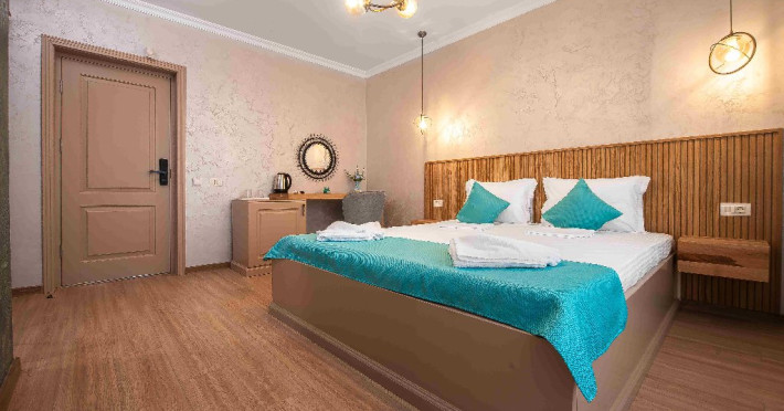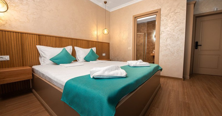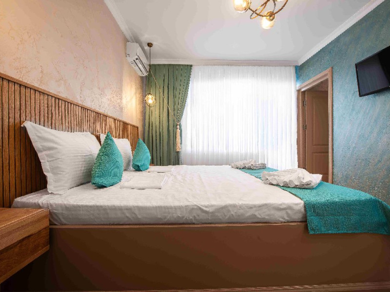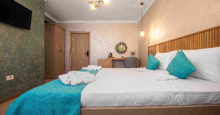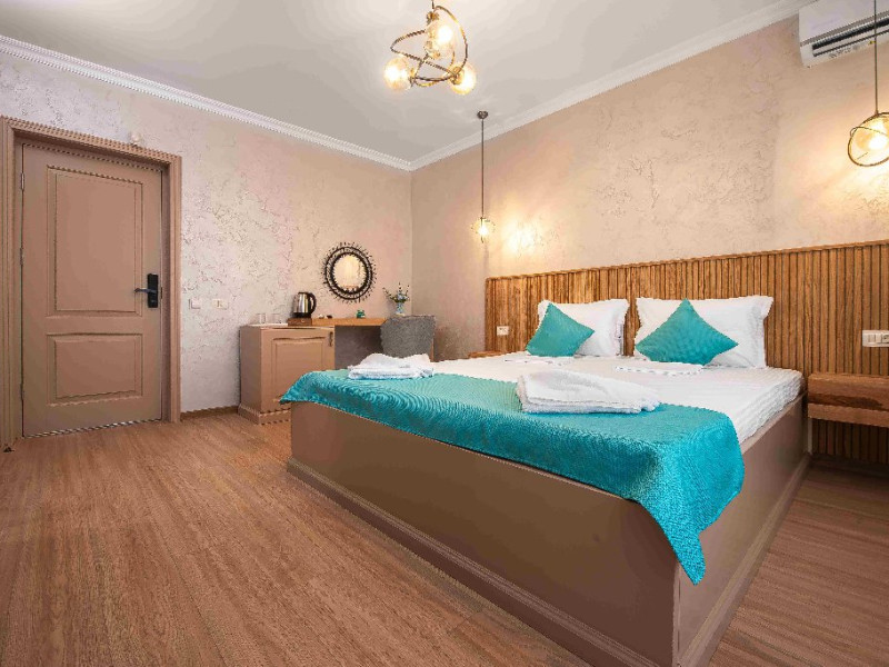 CAMERA DUBLA DELUXE (2): suprafata 23 mp, pat matrimonial king size: 180/200 (saltea ortopedica Memory Cotton spuma memory), aer conditionat inverter, minibar, TV Smart Led cu ecran plat, servicii streaming NETFLIX, baie proprie cu cabina de dus, uscator de par, umerase, fierbator: apa, ceai, cafea, articole de toaleta, balcon/terasa, mobilier terasa, internet WI-fi.