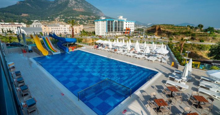Localizare: La 10 km de centrul orașului Alanya, 35 km de Aeroportul Gazipasa și 135 km de Aeroportul Antalya. Facilitati hotel: Minimarket, coafor, sală TV, bibliotecă, patiserie, baruri, 1 piscină interioară, tobogan cu 3 benzi, animație în piscina principală, umbrele de soare, șezlonguri și perne și prosoape sunt gratuite. Internetul wireless este gratuit în camere și în toate zonele publice. Facilitati camere: Cameră Standart (21m2): Duș, WC, uscător de păr, aer condiționat, telefon, TV prin satelit, minibar, seif, podeaua este acoperită cu laminat sau ceramică, un balcon cu vedere la mare/terren. Servicii contra cost: Seif, minibar, Suc proaspăt de portocale și băuturi importate, gustări și alte băuturi în minibar, toate băuturile alcoolice de import și băuturile alcoolice tari pe plajă, toate băuturile în clubul de noapte, restaurantul à la carte. SPA, masaj, biciclete, scufundări, banana-boat, jet ski, parasailing (activități pe plaja hotelului). Sporturi: Tenis de masă, volei (pe plajă), fitness, baie turcească, saună, baie de aburi, o piscină în aer liber, o piscină interioară (piscina interioară poate fi închisă din cauza COVID-19), 3 tobogane cu apă, 2 piscine pentru copii.Info