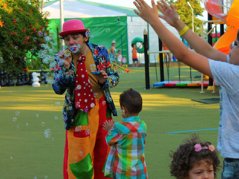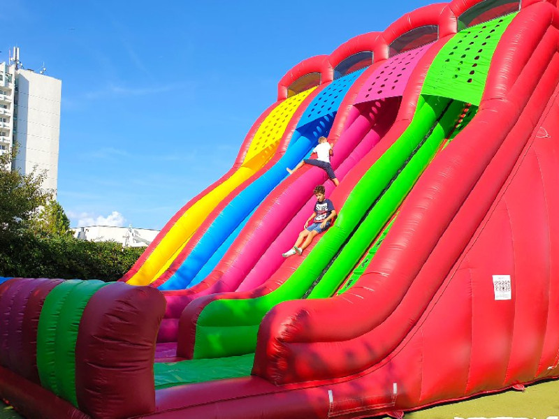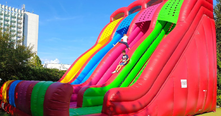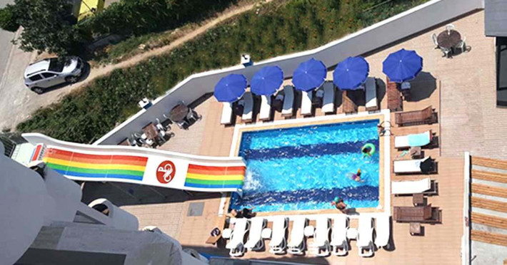 Loc de joaca Kiddo Play in imediata apropiere a piscinei astfel incat parintii se pot relaxa linistiti stiind copiii aproape, iar cei mici se vor simti de minune. Locul de joaca detine si un tobogan gomflabil de 10 m inaltime.