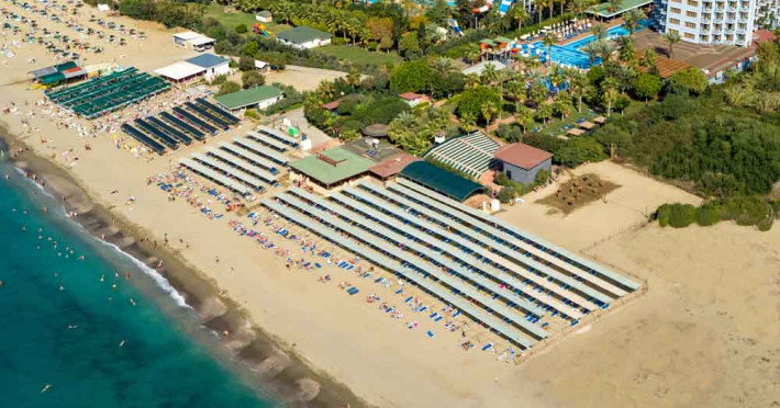 Prin gradina hotelului ajungeti la plaja privata cu nisip si pietricele mici, la dus si la barul cu gustari/pe plaja. Serviciul nostru de plaja, bar pe plaja si gustari sunt folosite ambele cu Hotelul Caretta Relax. Umbrele de soare/cort, sezlonguri, saltele sunt disponibile gratuit la piscina si pe plaja. Este disponibila cabina de dus si dressing pe plaja. Servirea prosoapelor si schimbarea la plaja si piscina sunt gratuite. Nu se ofera bauturi alcoolice (cu exceptia berii) pe plaja. Toate bauturile sunt servite cu sticla de plastic la plaja.