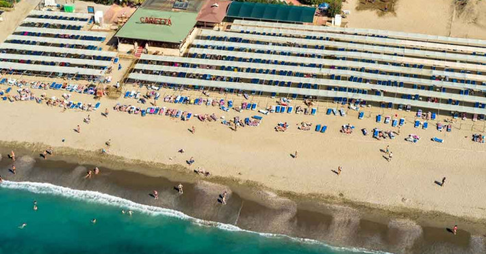 Plaja privata este de 150 m, la cativa pasi de hotel si are un amestec de nisip si pietricele mici, dus si Snack-/ bar pe plaja. Plaja apartine Hotelurilor Caretta si este folosita atat cu Hotelul Caretta Beach. Umbrele de soare/cort, sezlonguri, saltele sunt disponibile gratuit la piscina si pe plaja. Este disponibila cabina de dus si dressing pe plaja. Oferirea prosoapelor si schimbarea la plaja si piscina sunt gratuite. Nu se ofera bauturi alcoolice (cu exceptia berii) pe plaja. Toate bauturile sunt servite in sticla de plastic la plaja.