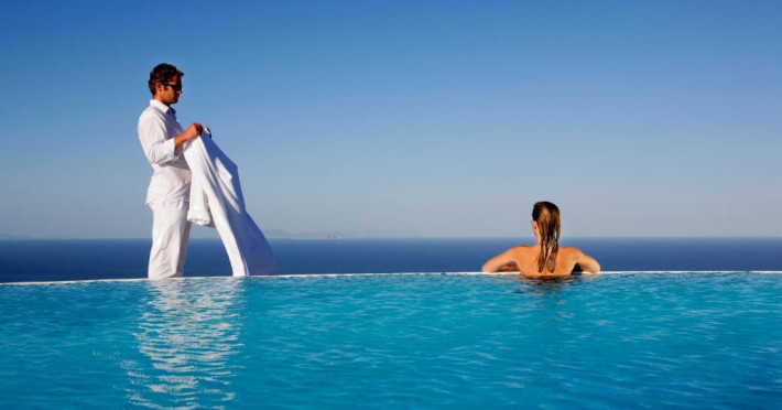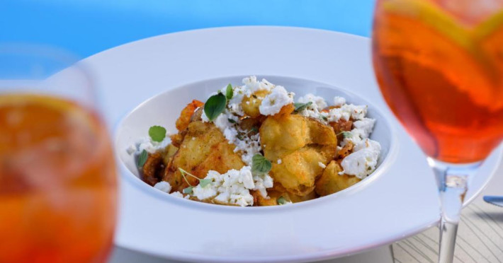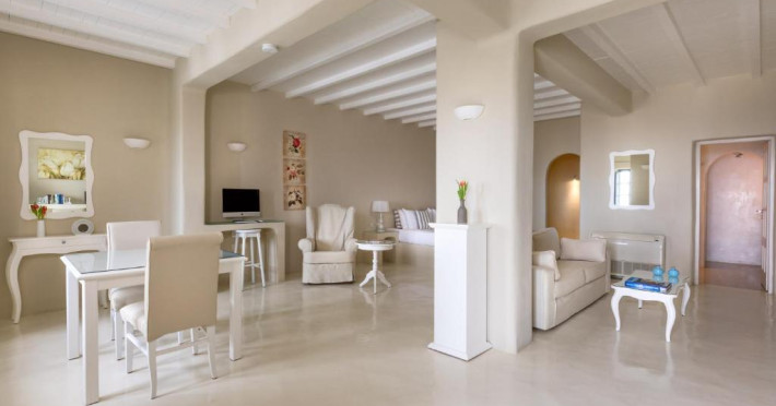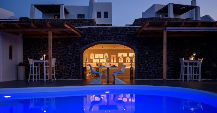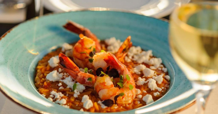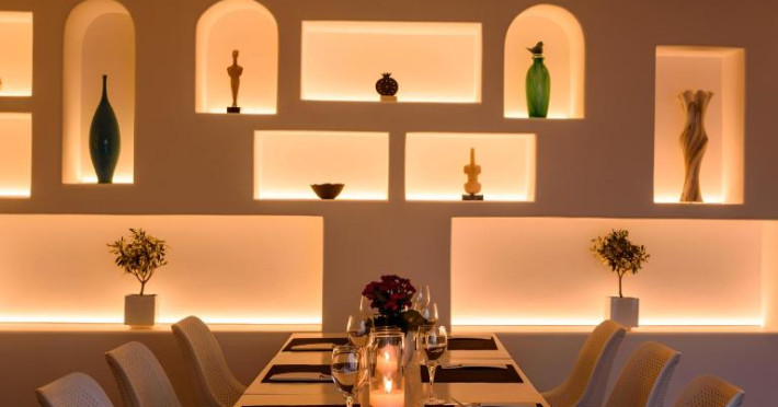 Pe tot parcursul zilei, restaurantul și lounge barul oferă cocktailuri și mancăruri mediteraneene și tradiționale cu vedere la mare. Micul dejun, pranzul și cina pot fi servite și pe terasele mobilate ale camerelor sau in zona lor privată de luat masa.