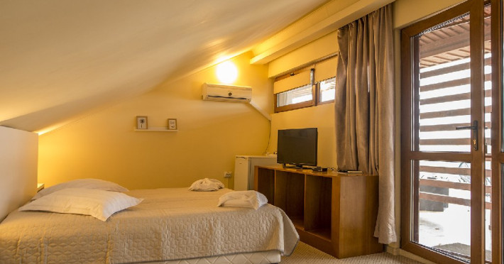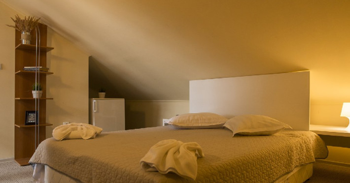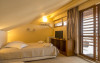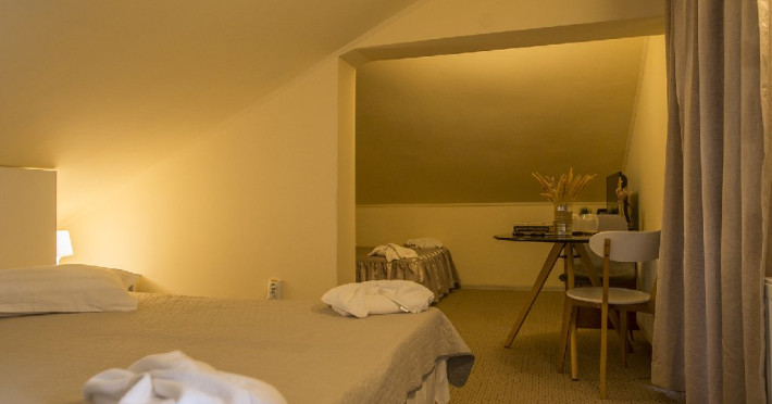 Camera Family cu terasa la mansarda este compusa din doua incaperi fara usa despartitoare si are o terasa cu vedere la gradina. In prima incapere exista doua paturi single, iar in a doua a incapere alte doua paturi single.