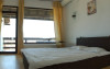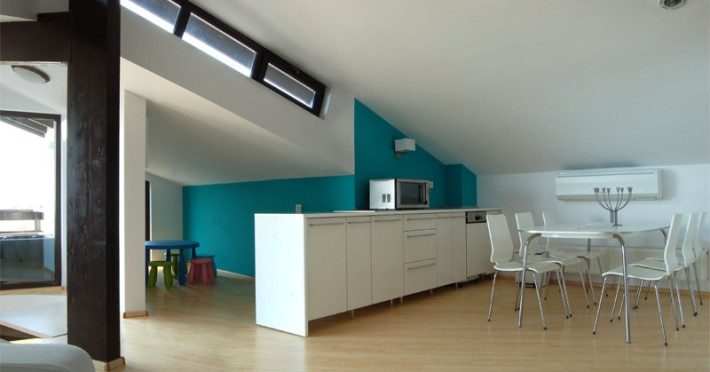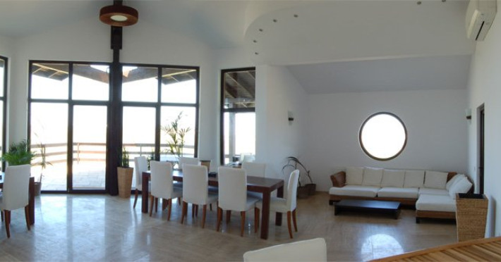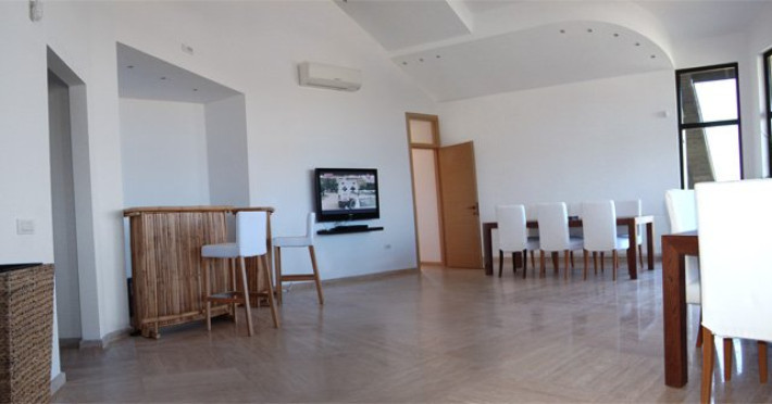 Etaj: La etaj se afl un apartament compus din living care incorporeaza si buctria complet utilat. Livingul se deschide de asemenea ctre o teras. Cele dou dormitoare de la etaj, prezint aceleasi utilitti ca si cele de la parter: un pat matrimonial, aer conditionat si baie proprie. Toate bile sunt cu cabin de dus.