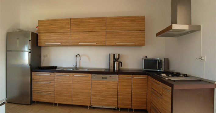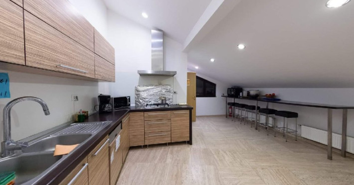 Buctria este dotat complet: aragaz, cuptor cu microunde, masina de splat vase, frigider, vesel, etc.