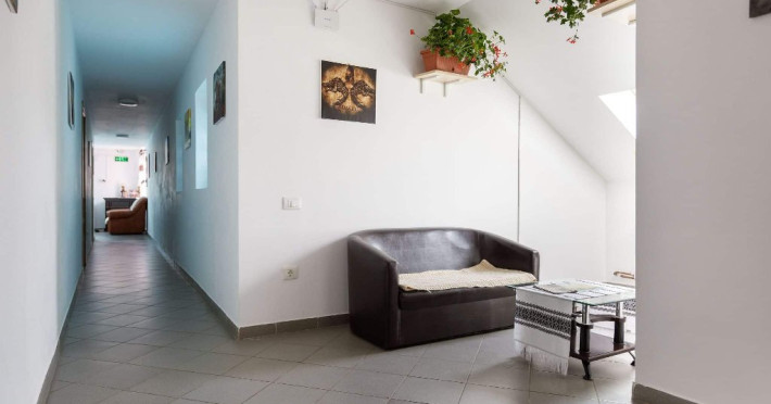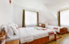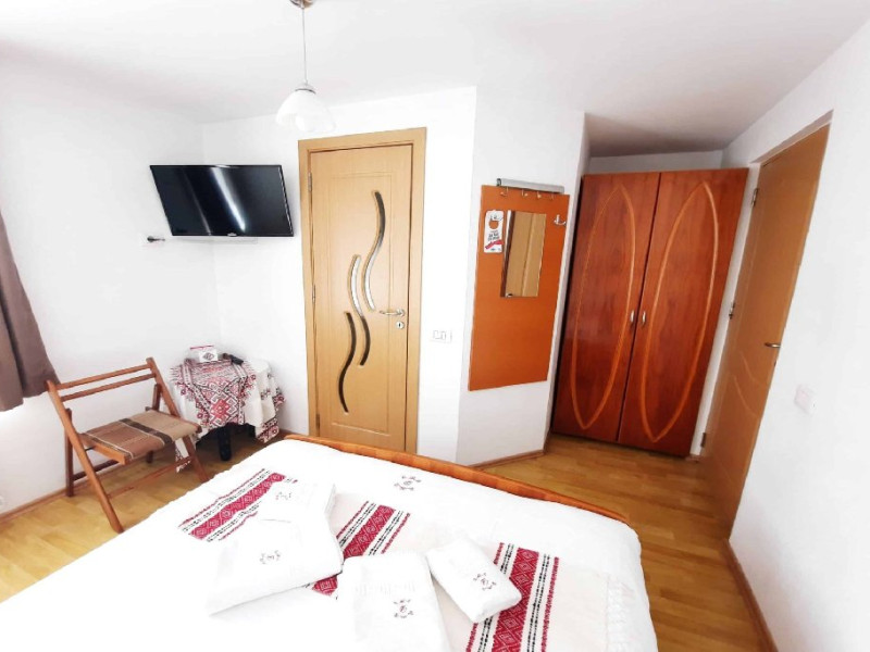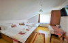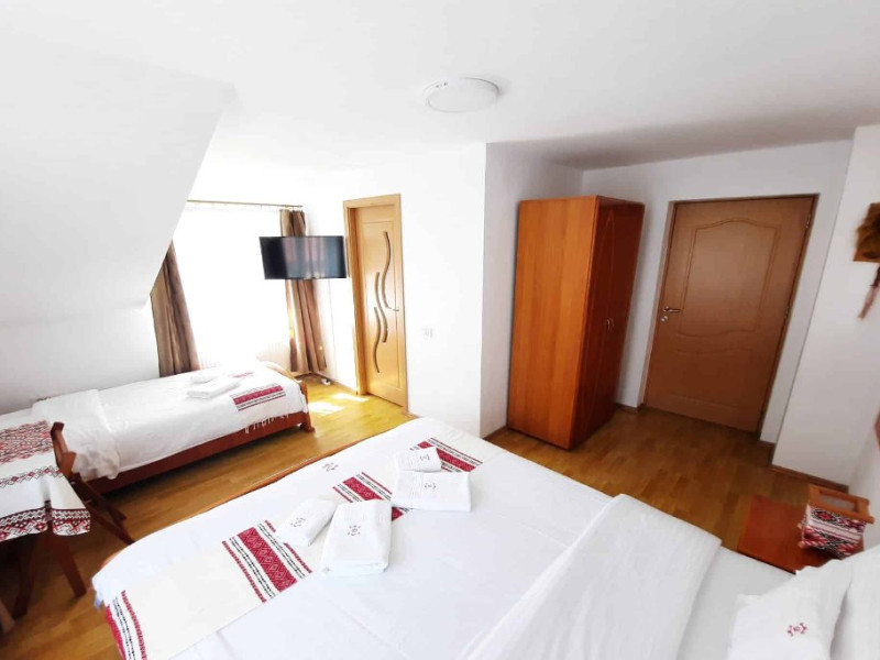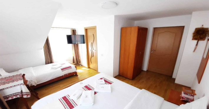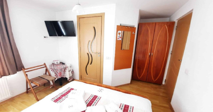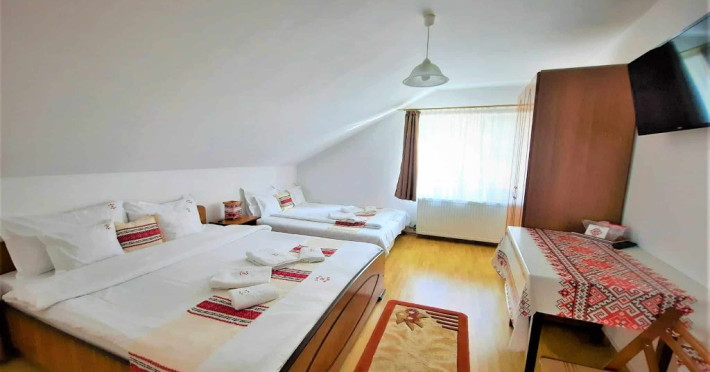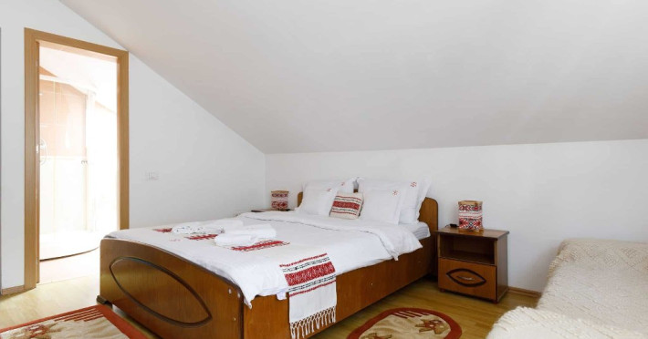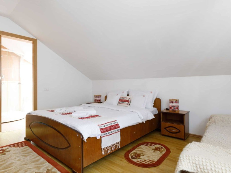 Camera family este mansardata si dispune de un pat matrimonial 160 x 200 cm si o canapea extensibila 160 x 200 cm.