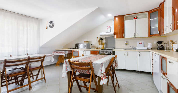 âTraditie. Ospitalitate. Confortâ Situata la poalele Cetatii Rasnov, intr-un tinut in care vestigii ale istoriei medievale se impletesc cu frumusetile naturii, Casa Dacica va intampina cu confort si ospitalitate, intr-un decor traditional cu tematica dacica. Casa are de 17 locuri cazare dispuse astfel: 1 apartament, 1 camera cvadrupla, 1 camera tripla, 2 camere duble si 1 camera dubla cu balcon, completate cu un living cu semineu, o baie de serviciu si o bucatarie complet utilata, in care modernul cu traditionalul se imbina armonios. Casa dispune de incalzire cu centrala proprie cu apa calda si caldura non-stop. Apartamentul este pretabil si persoanelor cu handicap, avem rampa de acces, iar baia este dotata cu suporti speciali. Toate camerele au bai proprii cu cabina de dus, uscator de par, articole de baie. Oaspetii nostri au la dispozitie internet WiFi gratuit si nelimitat, parcare supravegheata video, gratar, terasa acoperita si balansoar. Oferim oaspetilor nostri lemne pentru aprins gratarul si sugestii privind obiectivele de vizitat in zona. Pentru relaxare, oferim turistilor jocuri de societate: jocuri de rummy, table, carti, sah, aparat fitness, etc. La cerere, oferim servicii de masa in regim catering. Se poate achita cu card/tichete de vacanta masa pentru restaurant La Promenada numai la unitate. Plata se poate face cu cash, card la POS sau cu tichete si/sau carduri de vacanta, OP sau depunere in cont bancar si direct la unitate. IMPORTANT: REGIM CAZARE COPII: Copiii pot fi cazati numai in camerele tripla, de familie sau apartament indiferent de varsta si cu parintii in camera dubla pana in varsta de 2 ani. In camera dubla cu balcon NU cazam decat maxim 2 persoane (adult cu copil sau 2 adulti). Oferim servicii fara plata: - Trezirea clientilor la solicitare - Primirea si transmiterea mesajelor si a corespondentei pentru clienti - Informatii privind orarul mijloacelor de transport - Informare turistica - Pastrarea bagajelor - Pastrarea obiectelor uitate - Comenzi taxi Servicii cu plata: - Servicii telefonice locale, interurbane si international - Facilitati de spalat, uscat si calcat - Preluarea turistilor din Brasov/Bucuresti/Sibiu - Ghidaj turistic profesional acreditat Obiective Turistice: Cetatea Taraneasca din Rasnov, Dino Parc, Pestera Valea Cetatii, Biserica Evanghelica, Biserica Sf. Nicolae, Cheile Rasnoavei, Castelul Bran la 12 km, Poiana Brasov la 9 km, orasul Brasov cu foarte multe obiective turistice si culturale: Biserica Neagra, Casa Sfatului, Prima Scoala Romaneasca, Biserica Sf. Bartolomeu, Turnul Alb. Activitati: Trasee turistice: bungee jumping, tiroliana, pendul, slackline (mersul in echilibru pe o coarda elastica), escalada, rapel, tir cu arcul, tir cu pusca, mountain bike, ATV in Cheile Rasnoavei, echitatie, fotbal pe teren acoperit, paintball, ski in Poiana Brasov; in Brasov: Paradisul Acavatic, Aventura Parc, Superland â cel mai mare parc destinat copiilor din SE Europei sau Wolf Adventure in Zarnesti. Informatii suplimentare: - Check-in dupa ora 15:00 - Check-out inainte de ora 11:00 - Animalele de companie nu sunt acceptate - Fumatul interzis in interiorul casei - Ore liniste 22:00 - 7:00 - Boxele portabile NU sunt permise în locaÈie - Gratar permis între orele 12:00-21:00, fÄrÄ muzicÄ. In ceea ce priveste masurile de securitate, va putem spune ca avem afise de informare cu privire la distantarea sociala, purtarea mastii, folosirea covorasului cu dezinfectant la intrare si posibilitatea dezinfectarii mainilor la intrare, in bucatarie sau in camere, precum si termometru digital. Pentru check in, va intra o singura persoana in receptie pentru inregistrare iar cheia se va afla in usa. Pentru dezinfectarea suprafetelor, a spatiilor interioare si exterioare, folosim dezinfectantul biocid Surfanios. Accesul in bucatarie este limitat la 4 persoane sau o familie, spatiul dintre mese fiind de 1,5 metri. Masa va putea fi servita in mod exceptional in camera, inclusiv pe terasa, in self catering sau catering, existand restaurante ce asigura acest serviciu in Rasnov. Vesela se igienizeaza si dezinfecteaza cu Biclosol in masina de spalat vase din bucatarie. Asadar va oferim cazare in conditii de maxima siguranta cu posibilitatea anularii gratuite sau a reprogramarii sejurului in caz de eventuale alte stari speciale. Integral si in WEEK-END (vineri, sambata, duminica) SE INCHIRIAZA PENTRU MINIM 2 NOPTI!!. Renovata in anul 2018, Casa Dacica este situata la baza Cetatii Rasnov si la 200m de Restaurantul La Promenada. Suntem la zece minute departare de partia de ski din Poiana Brasov si la 5 minute de partia olimpica de sarituri cu schiurile de pe Valea Carbunarii. Localizare: Str Teilor Nr.44B, Rasnov Coordonate GPS: 45.595145356682, 25.471324928311Datorita dinamicitatii domeniului disponibilitatea ofertelor se modifica de la un moment la altul. De aceea ofertele sunt valabile in limita locurilor disponibile. Agentia nu este responsabila pentru eventualele neconcordante care pot aparea intre informatiile privind tarifele si alte detalii din site si informatiile primite in agentie. In aceste cazuri vor avea prioritate, intotdeauna, informatiile primite in agentie.