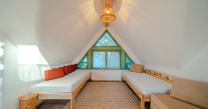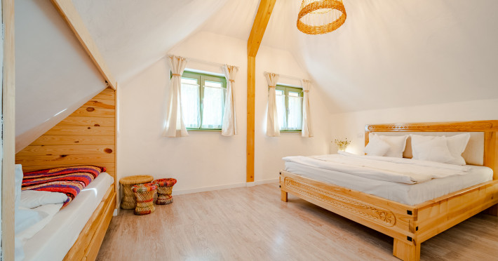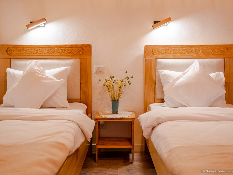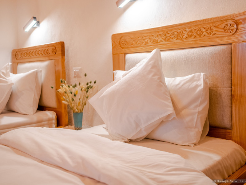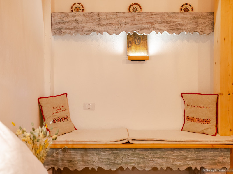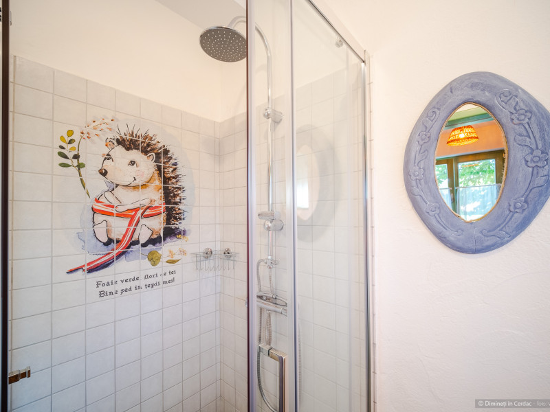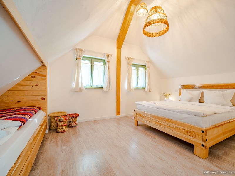 Casa Dimineti in Cerdac are aspect traditional si dotari moderne discrete. Locatia imbina autenticul romanesc din zona Neamt, farmecul povestilor din copilaria petrecuta la bunici si materialele naturale cu care a fost construita. Cerdacul care impodobeste gratios doua laturi ale casei, casuta din copac, locul pentru foc de tabara, gradina strajuita de copaci batrani, aleile pietruite si leaganul din curte sunt doar cateva detalii pe care va invitam sa le descoperiti pe cont propriu. Confortul oaspetilor nostri este sporit de 4 bai, 2 livinguri spatioase dintre care unul dotat cu soba traditionala cu pat incalzit si bucatarie deschisa, numeroase zone de relaxare sau stat la povesti cu cei dragi. Gradina casei strajuita de copaci seculari va fi doar a voastra sa va jucati cu copiii, sa va ascundeti de canicula vara sau sa va dati cu sania pe derdelusul la vale cand avem noroc sa cada zapada. Facilitati Casa Dimineti in Cerdac ⢠Internet wireless ⢠Rampa acces persoane cu dizabilitati ⢠Living parter de 25 mp cu soba traditionala ⢠Living mansarda 32 mp cu loc de joaca copii ⢠Bucatarie complet dotata si utilata ⢠Incalzire prin pardoseala si apa calda asigurate de pompa de caldura ⢠Welcome kit (cafea, ceai, condimente de baza) ⢠Parcare gratuita in incinta ⢠Loc de joaca pentru copii ⢠Loc pentru foc de tabara si agrement ⢠Gradina privata de 5500 mp ⢠Sistem de monitorizare video Casa Dimineti in Cerdac este alegerea potrivita pentru orice sejur pe parcursul anului, cand doriti sa va bucurati de momente unice alaturi de familie sau prieteni. Discover Northern Romania and the lovely Neamt Region, staying at âVerranda Morningsâ House. This 4 rooms old cottage, newly renovated is surrounded by a huge green garden where kids can safely play outdoors. Located near the forest, the house is easily accessible by car or train and close to the mountain town of Piatra Neamt. You have access to all the modern amenities and a large selection of slow traveling and eco-friendly activities that can be organized any season you choose to visit. The comfort of our guests is enhanced by 4 bathrooms, 2 large living rooms, one of which is equipped with a traditional stove with a heated bed placed in an open kitchen and several inside and outside relaxation areas. The huge garden that surrounds the house is inhabited by old trees, cheerful birds and little wild animals. It was carefully arranged to become a safe playground for children, a private green spot where you may hide from heat in the Summer or to become a private snow slide for having fun during Winter. Facilities: ⢠Wireless Internet connection ⢠Ramp access for people with disabilities ⢠Ground floor living room of 25 sqm with traditional clay stove ⢠Attic living room 32 sqm with childrens playground ⢠Fully equipped kitchen and large dining place ⢠Underfloor heating and hot water provided by heat pump ⢠Welcome kit (coffee, tea, basic spices) ⢠Free parking on site ⢠Outside Playground ⢠Garden campfire place, grill and recreation spots ⢠5500 sqm private garden ⢠Video monitoring system "Dimineti in Cerdac" House is the right choice for a holiday anytime throughout the year, when you are looking for spending unique moments with your family or friends.Datorita dinamicitatii domeniului disponibilitatea ofertelor se modifica de la un moment la altul. De aceea ofertele sunt valabile in limita locurilor disponibile. Agentia nu este responsabila pentru eventualele neconcordante care pot aparea intre informatiile privind tarifele si alte detalii din site si informatiile primite in agentie. In aceste cazuri vor avea prioritate, intotdeauna, informatiile primite in agentie.