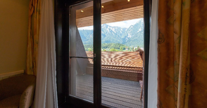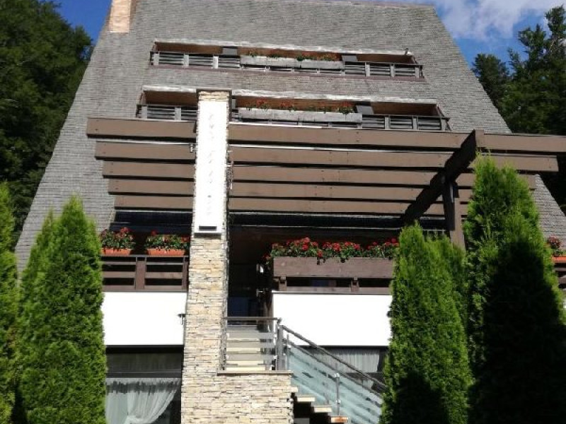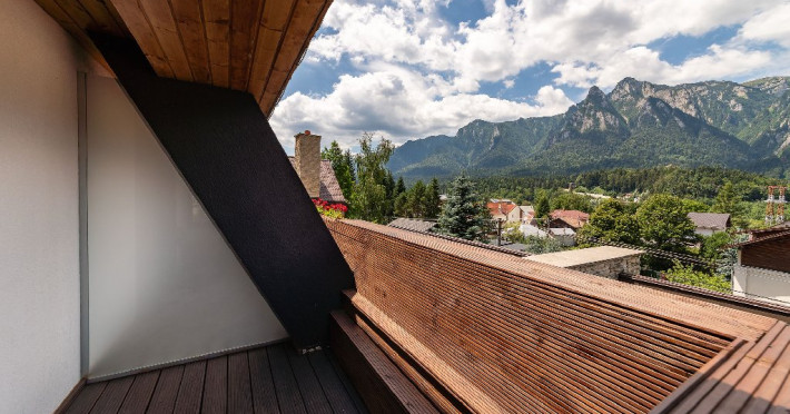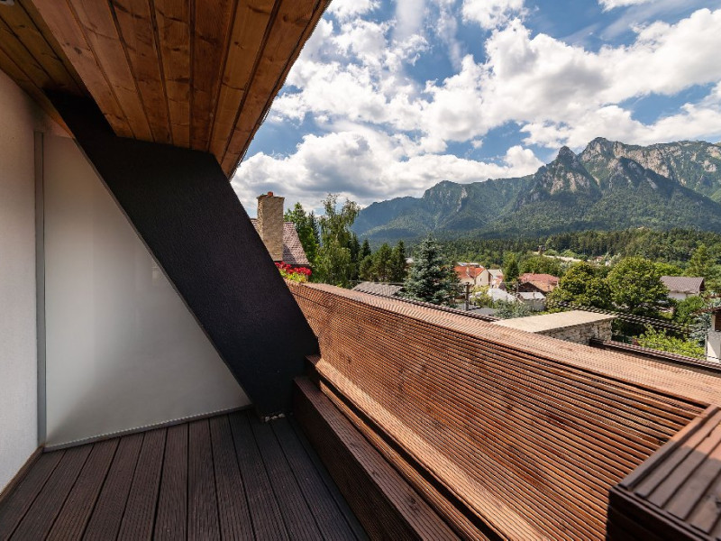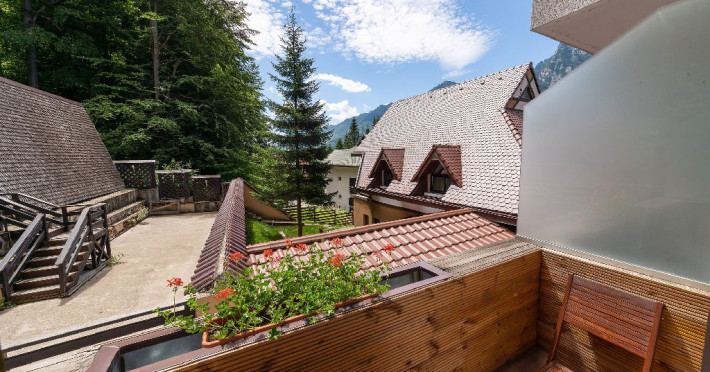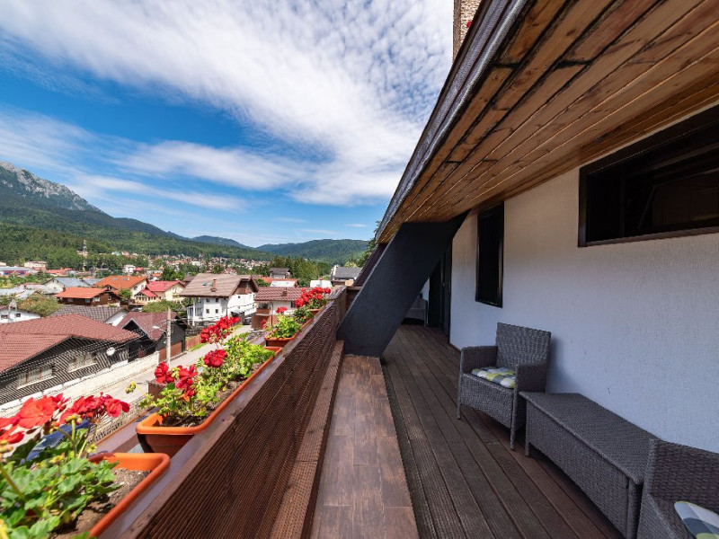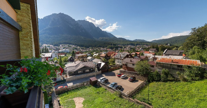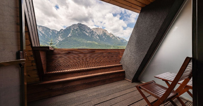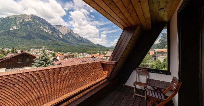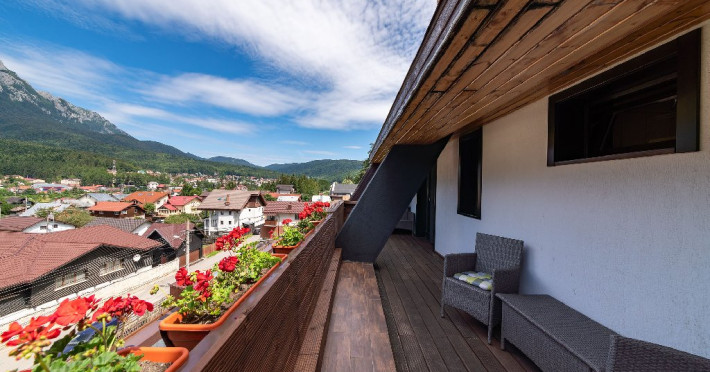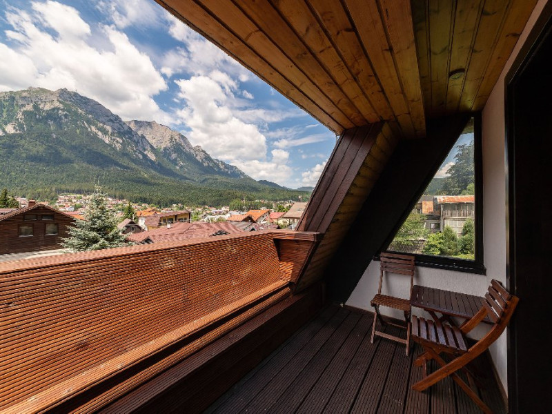 Apartamentul cu vedere la munte se afla la nivelul 3 al locatiei si are vedere panoramica spre Muntii Bucegi. Acesta este compus dintr-un living generos cu canapea extensibila si un dormitor cu pat matrimonial. Din ambele incaperi se poate accesa balconul ce se intinde pe intreaga lui suprafata. Apartamentul este deservit de o singura baie.