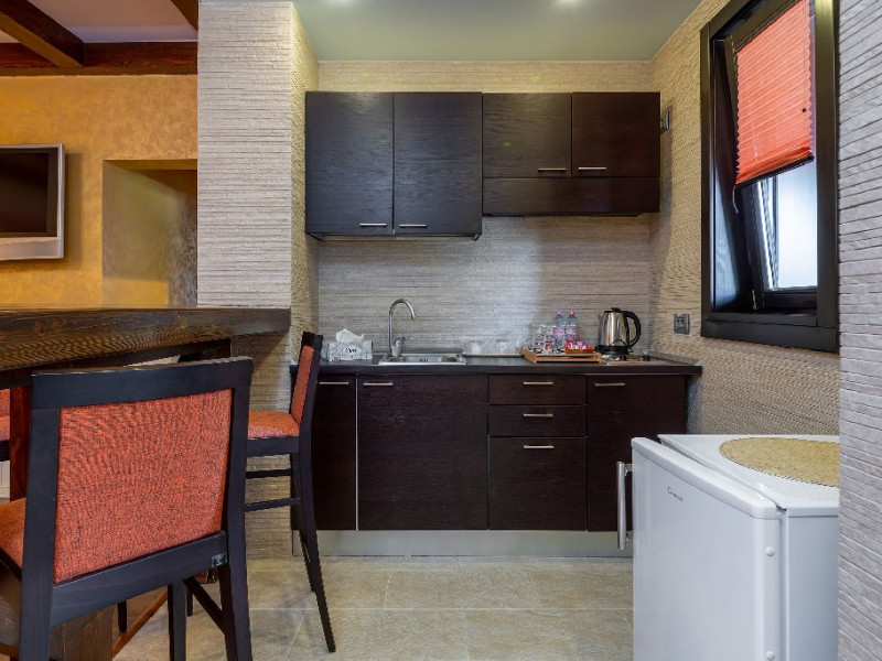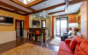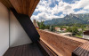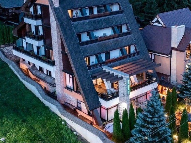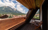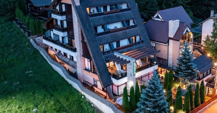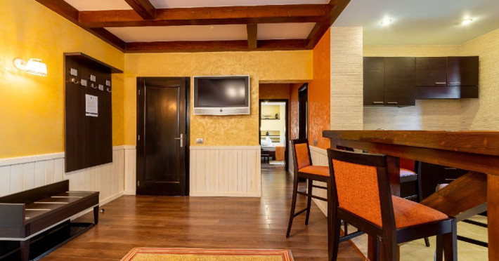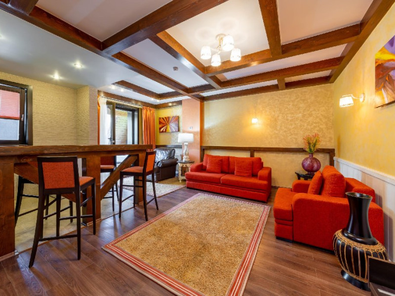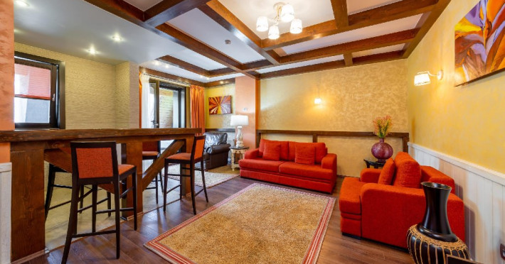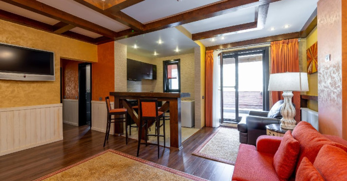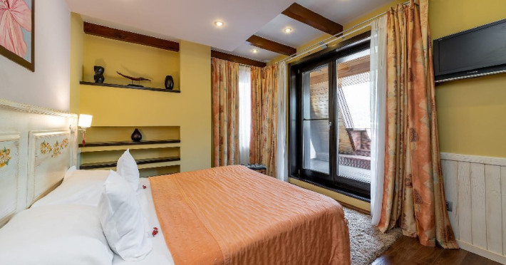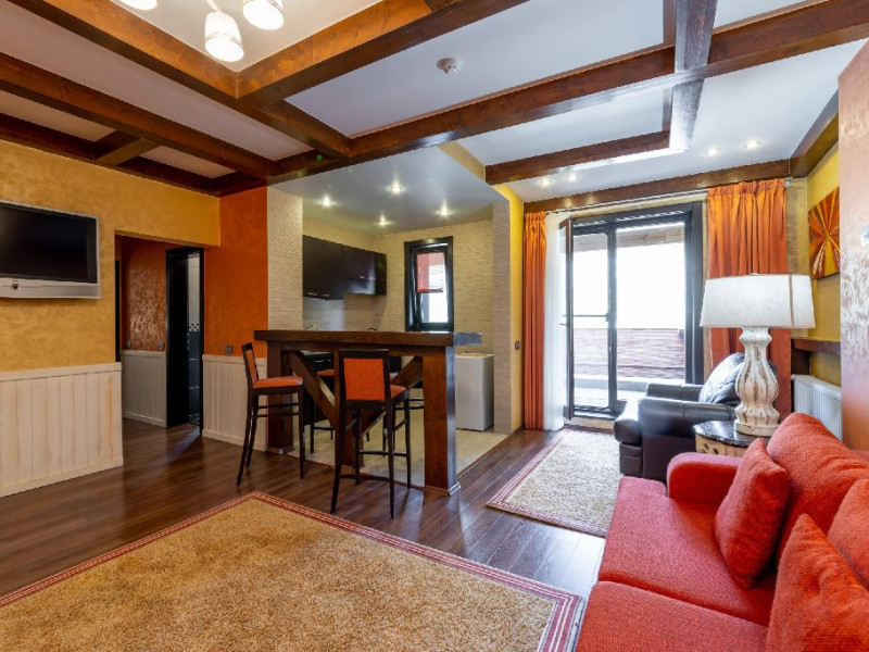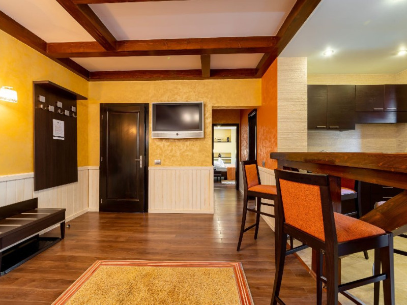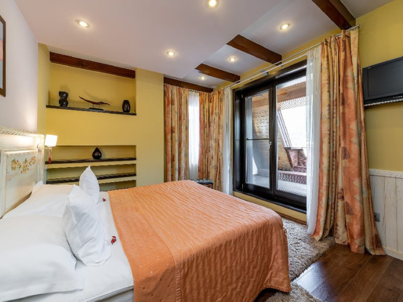 Apartamentul cu vedere la munte se afla la nivelul 3 al locatiei si are vedere panoramica spre Muntii Bucegi. Acesta este compus dintr-un living generos cu canapea extensibila si un dormitor cu pat matrimonial. Din ambele incaperi se poate accesa balconul ce se intinde pe intreaga lui suprafata. Apartamentul este deservit de o singura baie.