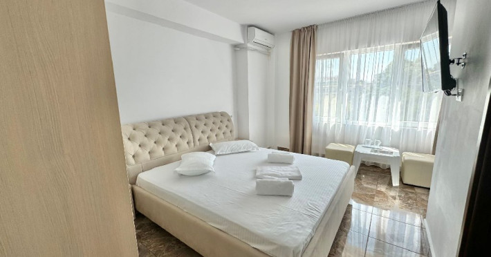 Apartamentele sunt formate dintr-un dormitor cu pat matrimonial, living cu canapea extensibila, zona de servit masa, mini frigider, baie cu dus, balcon inchis si sunt situate la parter si etajul 1.