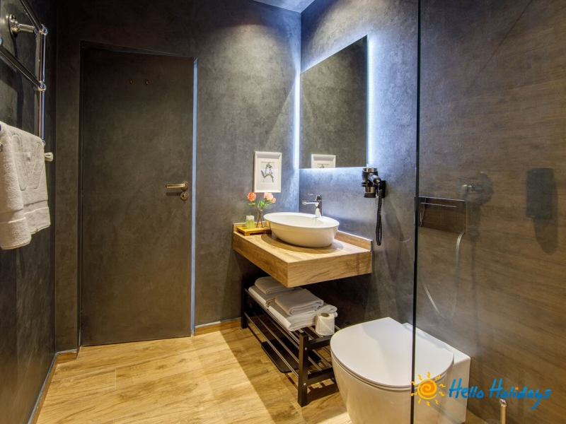 Camerele sunt amenajate la cele mai inalte standarde, cu TV smart, cablu TV, internet, saltele ortopedice cu topper dublu, King size, perne hipoalergenice /cu puf, masuta de cafea, fotoliu si otoman de piele, aparat cafea, seif, minibar, climatizare, parchet de bambus, si bai dotate cu cabina de dus, uscator de par, kit igiena, papuci, halat de baie si sistem de apelare in caz de urgenta.
