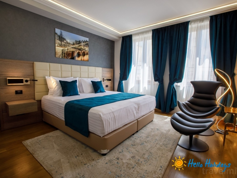 Square view Junior Suite este format dintr-o camera dubla cu 1 pat matrimonial, dispunand de o suprafata generoasa de 40 mp. Capacitate maxima 2 adulti + 1 copil 0-6,99 ani (in pat cu parintii). Suprafata generoasa de 48 mp