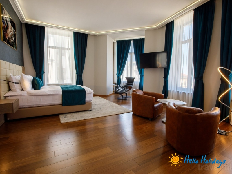 Square view Junior Suite cu balconsofa este format dintr-o camera dubla cu 1 pat matrimonial si 1 canapea extensibila, dispunand de o suprafata generoasa de 40 mp. Capacitate maxima 2 adulti + 1 copil 0-13.99 ani/ 3 adulti. Suprafata generoasa de 48 mp