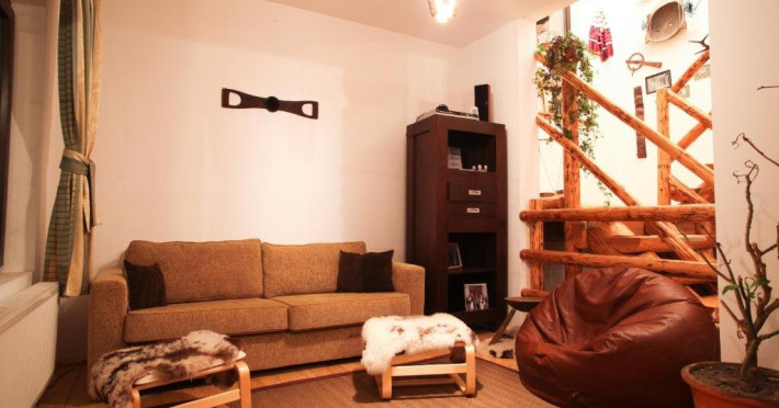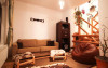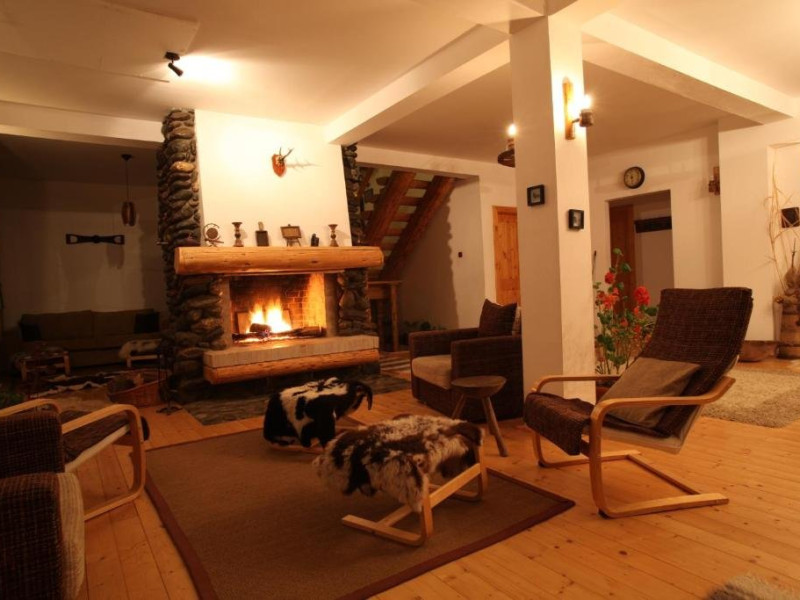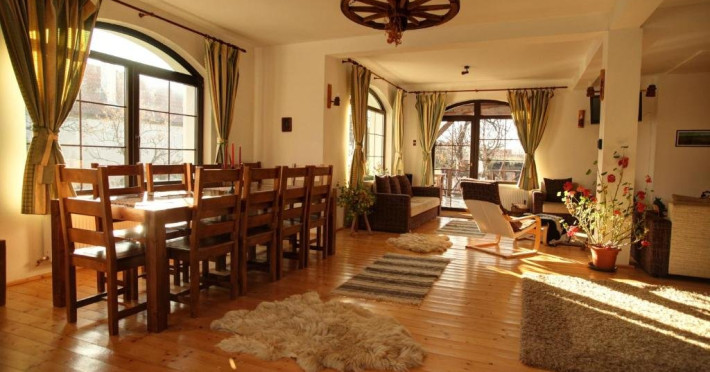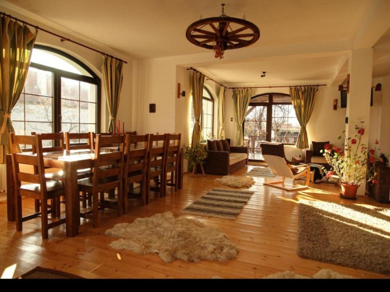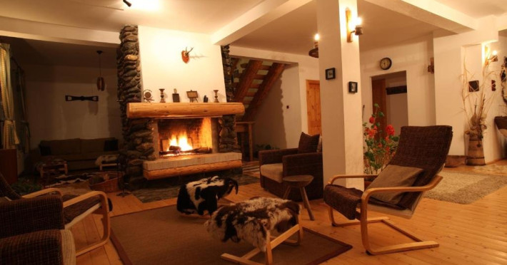 Spaiul livingului este armonios împãrit, semineul cu focar deschis i scara din buteni care urcã la mansardã reprezentând elemente cu greutate, care creazã o ambianã primitoare.