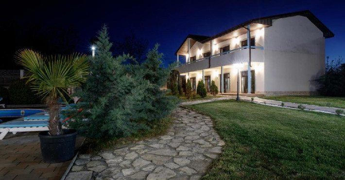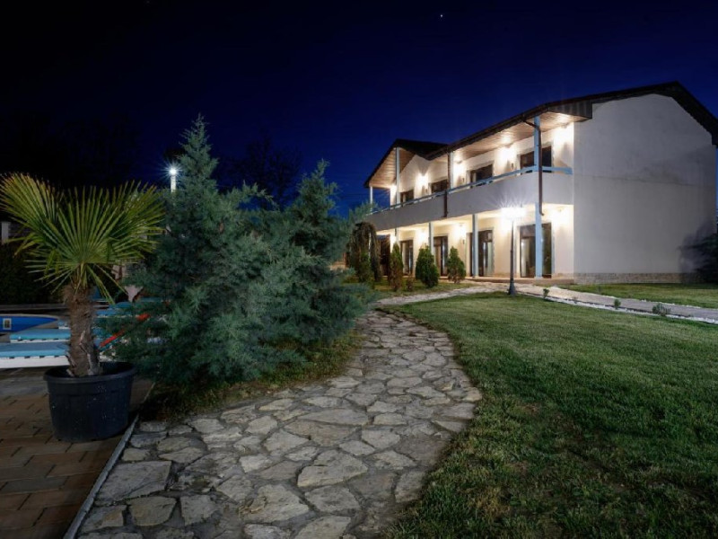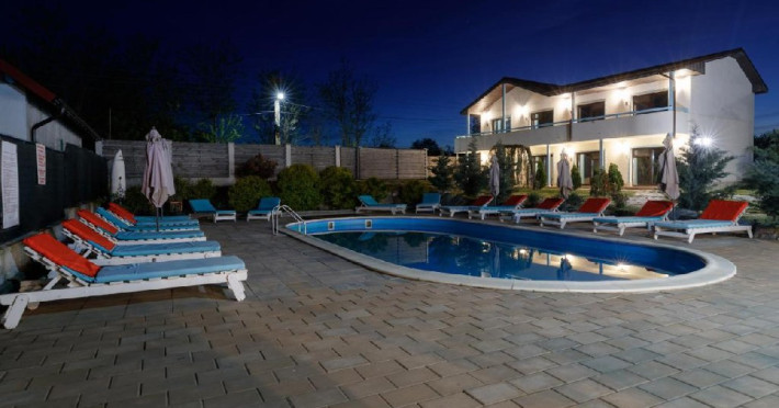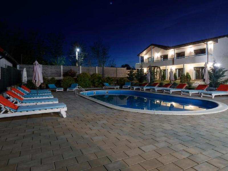 Descriere: Turistii se pot bucura de 4000 mp de curte unde vor gasi foarte multa verdeata, parcare interioara, restaurant, o terasa acoperita, o terasa in aer liber, piscina si jacuzzi. Fiind o locatie care isi doreste sa aduca zambetele pe fetele celor mici, dar si celor mari, va oferim o zona destinata exclusiv copiilor, adica un loc de joaca acoperit pentru cei mici cu o suprafata de 100 mp dotat cu jucarii modulare profesionale pe 2 nivele. De asemenea, acestia se pot bucura si de cei 200 mp amenajati in aer liber, care le pune la dispozitie un miniteren de fotbal si multe alte jucarii.