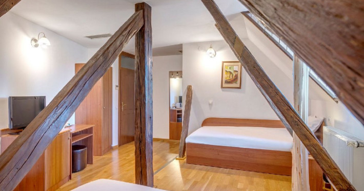 Elemente arhitecturale autentice, precum barnele de lemn reprezentative pentru zona Transilvaniei, arcadele sau tavanele cu stucaturi baroc, contribuie la farmecul istoric al cladirii, completat de facilitati moderne. Camerele ofera confort contemporan intr-un cadru cu caracter istoric, majoritatea avand vedere catre acoperisurile boeme ale Sibiului sau catre Piata Mare. Toate camerele sunt dotate cu aer conditionat, baie privata cu dus, uscator de par si cosmetice Prija, papuci, TV prin cablu, frigider, aparat pentru cafea si ceai.