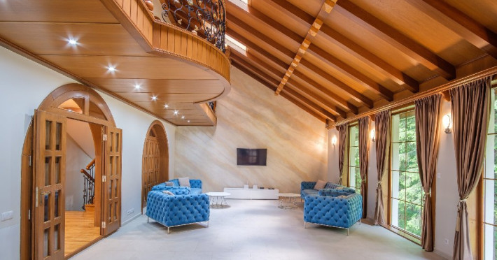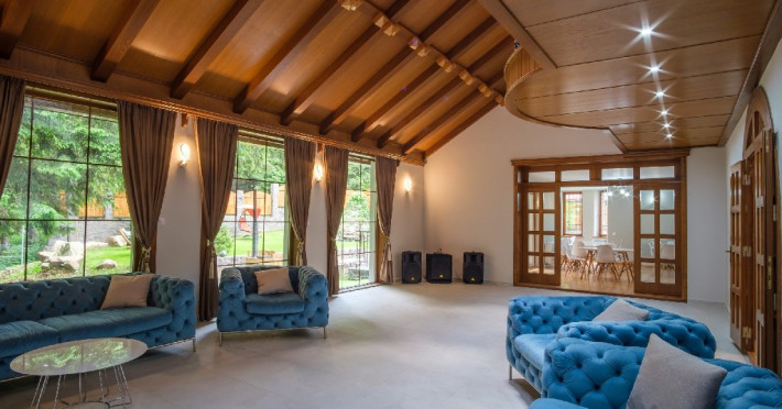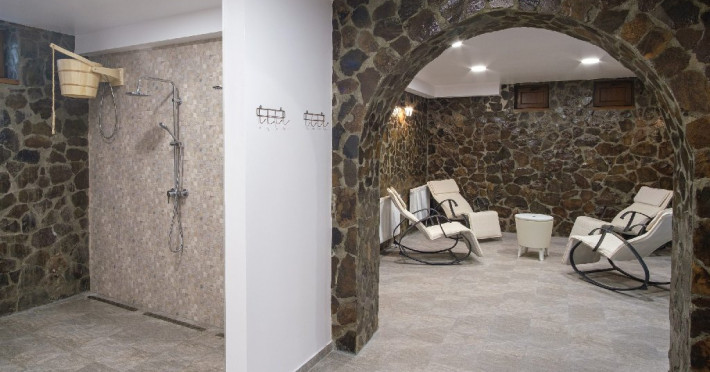 dispozitie un living comun, cu zona de relaxare si TV, zona de relaxare in camera de stica de pe terasa castelului, piscina interioara, sauna,