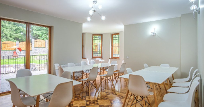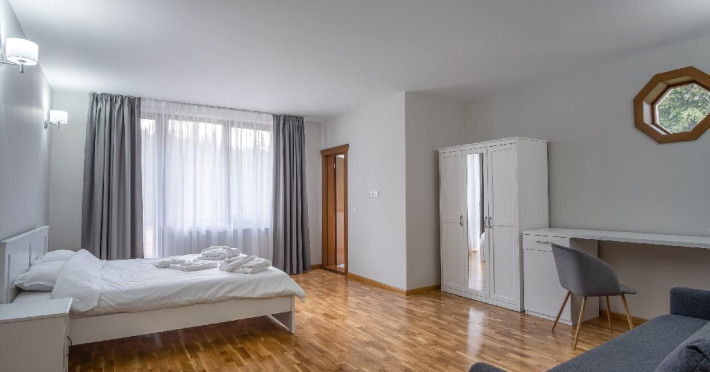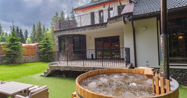 jacuzzi si ciubar exterior. De asemenea, exista o bucatarie comuna complet utilata, cu zona de luat masa.