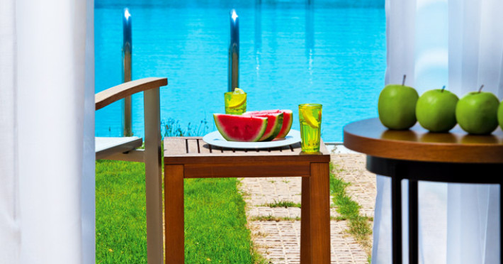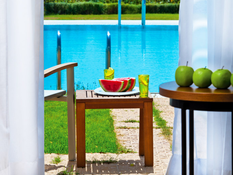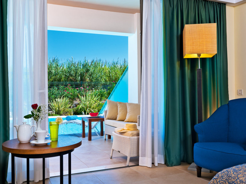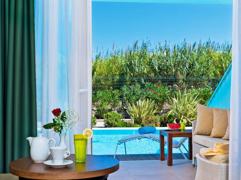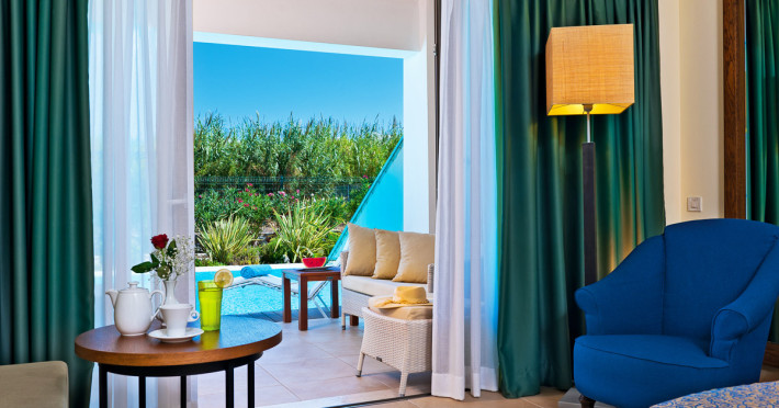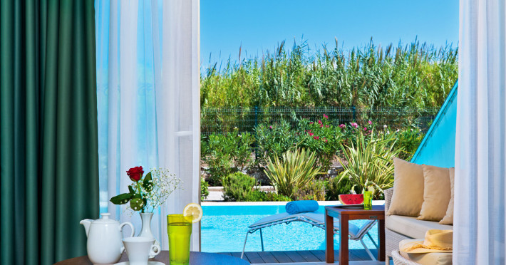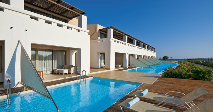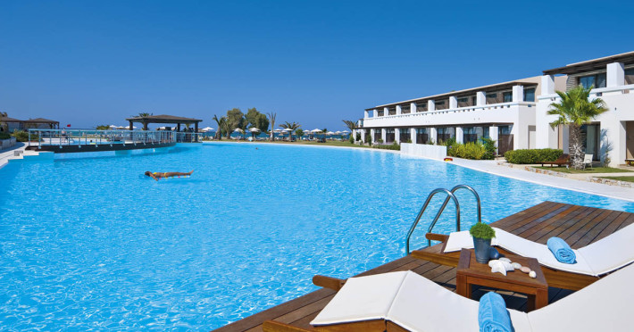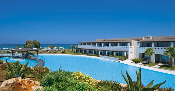 The Hotel consists of 150 accommodation units, a main free-style lagoon like swimming pool (simply glorious at 1700 sqm), a large reception/lobby area, four restaurants, a main bar, pool bar, mini club, boutique store, two tennis courts and the absolute finest element to seduce your senses – the Cavo Spada Spa.The Spa is an oasis of pleasure and pampering. Take in the calm and rejuvenate enjoying the indoor heated swimming pool, Jacuzzi, Turkish bath (hamam), Sauna, massages, beauty treatments and more.