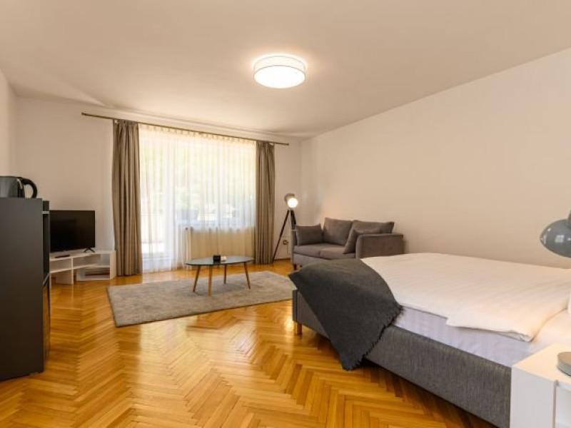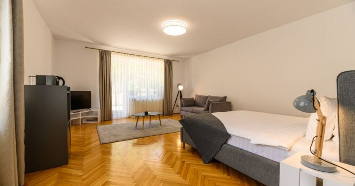 Apartament Deluxe cu chicineta si terasa proprie: baie cu dus, papuci de casa, uscator de par, televiziune prin cablu/satelit, balcon/terasa, fierbator pentru apa/filtru de cafea, bucatarie/chicineta, cuptor cu microunde, frigider, zona de relaxare.