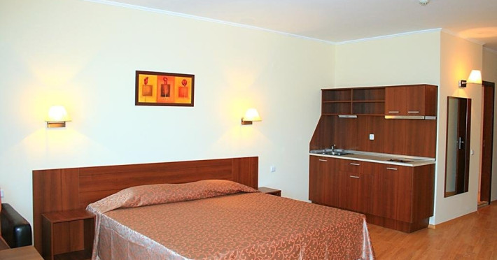 Studios (max ocupare 3 adulti cu 1 copil) - 50 mp cu vedere la mare sau la gradina cu 2 paturi separabile si 1 fotoliu extensibil sau pat pliant. Studiourile au aceeasi mobile precum cele double si o chicineta (tacamuri cu vesela, aparat de cafea, cuptoare, aspirator).