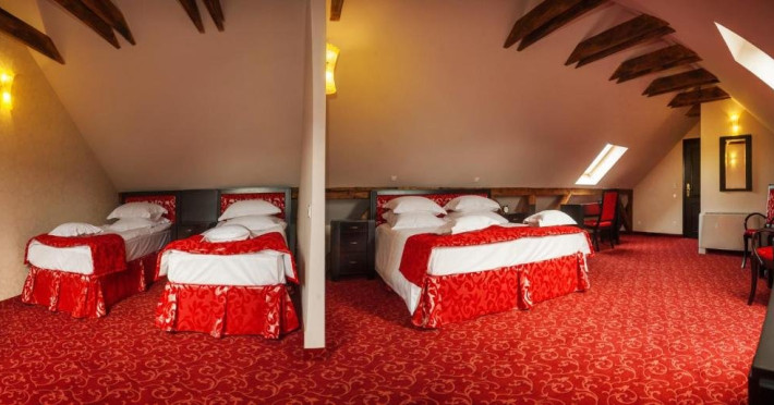 Apartamentul FAMILY de la mansarda este o optiune excelenta pentru o familie care doreste confort si intimitate. Cu o suprafata generoasa a camerei este o adevrata oaza de relaxare in mijlocul agitatiei orasului. Patul matrimonial si cele doua paturi single sunt lenjerii moi si confortabile, saltele si perne de foarte buna calitate necesare pentru un somn odihnitor si linistit . Este prevazut cu toate facilitatile moderne, inclusiv acces la internet, televizor, minibar si seif iar baia eleganta, de dimensiuni generoase, dispune de articole de toaleta de calitate si de un set complet de prosoape pentru fiecare membru al familiei.