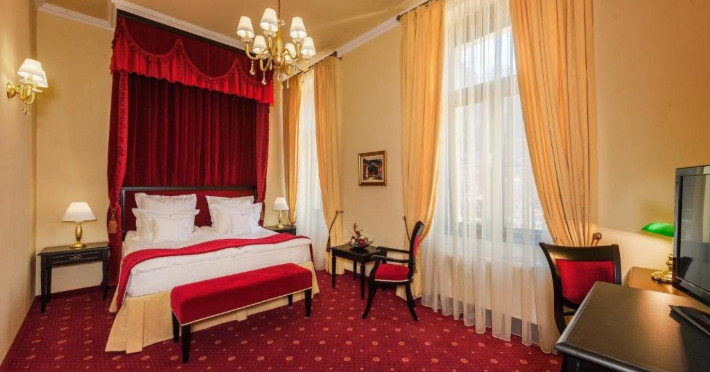 Camera Superioara cu vedere spre cetate si pat cu baldachin este un loc desprins dintr-un vis romantic. Decorata cu gust si atentie la detalii, aceasta camera spatioasa ofera tot confortul necesar pentru o experienta memorabila. Baldachinul patului de-un rosu aprins confera o intimitate speciala, iar lenjeria alba si moale invita si taie rasuflarea, aducand in camera un aer de mister si romantism.