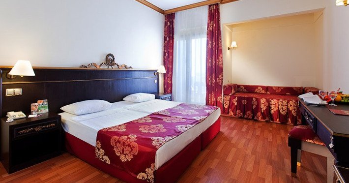 Facilitati hotel: Hotelul ofera oaspetilor sai multiple facilitati: restaurant principal, 2 restaurante a la carte, mai multe baruri, 3 piscine: interioara, exterioara, pentru copii, animatie, centru spa, baie turceasca, fitness, tenis de masa, camera de bagaje, discoteca, internet wi-fi, piscina pentru copii, loc de joaca pentru copii.