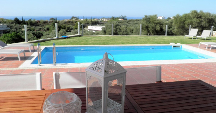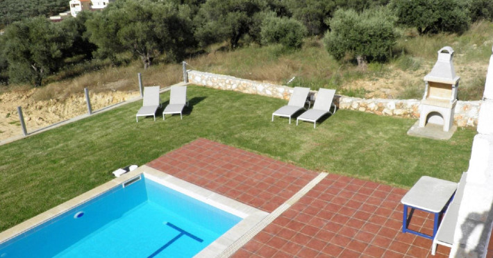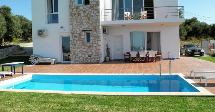 Villa DIMITRA is a two storey house with a private swimming pool and a plot of land. Built with the traditional element of stone, with unobstructed view, it looks out to the endless blue of the Cretan Sea and the wider area of Chania. Surrounded by green grass on its private plot, it offers unique moments of peace, relaxation, freedom and privacy for you and your family or friends. It is a two storey, comfortable, bright villa of 200 sqm, from the 100 sqm floor with an internal staircase that can accommodate a total of up to 13 people. Each floor has a living room with fireplace, bathoms, bedrooms and kitchen - the villa has 2 kitchens. Specifically: The ground floor has a living room with a three-seater sofa bed, fireplace, 2 bathrooms, fully equipped kitchen, 2 independent rooms (one with double bed and the other with 2 single beds) and a semi-detached room (twin beds) . On the large veranda overlooking the pool there is a table with its chairs as well as sun loungers. Also a barbecue with all its equipment (grills, ties, coals, coins, matches). The first floor also has a large living room with fireplace and 2 three-seater sofa beds, a fully equipped kitchen, two independent bedrooms with one double bed each, a bathroom and two balconies. On the balcony with amazing sea view, the surrounding area of Chania and the swimming pool, there is a table with its chairs. Even a smaller balcony of one of the two bedrooms, overlooks the green olive trees surrounding the villa. The villa has central heating and cooling / heating air conditioning throughout. All rooms have wardrobes and all beds have anatomic and comfortable mattresses. The private pool is 8m x 4m and 2m deep and is surrounded by lush green grass. The villa does not have a children's pool.Villa DIMITRA is a two storey house with a private swimming pool and a plot of land. Built with the traditional element of stone, with unobstructed view, it looks out to the endless blue of the Cretan Sea and the wider area of Chania. Surrounded by green grass on its private plot, it offers unique moments of peace, relaxation, freedom and privacy for you and your family or friends. It is a two storey, comfortable, bright villa of 200 sqm, from the 100 sqm floor with an internal staircase that can accommodate a total of up to 13 people. Each floor has a living room with fireplace, bathoms, bedrooms and kitchen - the villa has 2 kitchens. Specifically: The ground floor has a living room with a three-seater sofa bed, fireplace, 2 bathrooms, fully equipped kitchen, 2 independent rooms (one with double bed and the other with 2 single beds) and a semi-detached room (twin beds) . On the large veranda overlooking the pool there is a table with its chairs as well as sun loungers. Also a barbecue with all its equipment (grills, ties, coals, coins, matches). The first floor also has a large living room with fireplace and 2 three-seater sofa beds, a fully equipped kitchen, two independent bedrooms with one double bed each, a bathroom and two balconies. On the balcony with amazing sea view, the surrounding area of Chania and the swimming pool, there is a table with its chairs. Even a smaller balcony of one of the two bedrooms, overlooks the green olive trees surrounding the villa. The villa has central heating and cooling / heating air conditioning throughout. All rooms have wardrobes and all beds have anatomic and comfortable mattresses. The private pool is 8m x 4m and 2m deep and is surrounded by lush green grass. The villa does not have a children's pool.